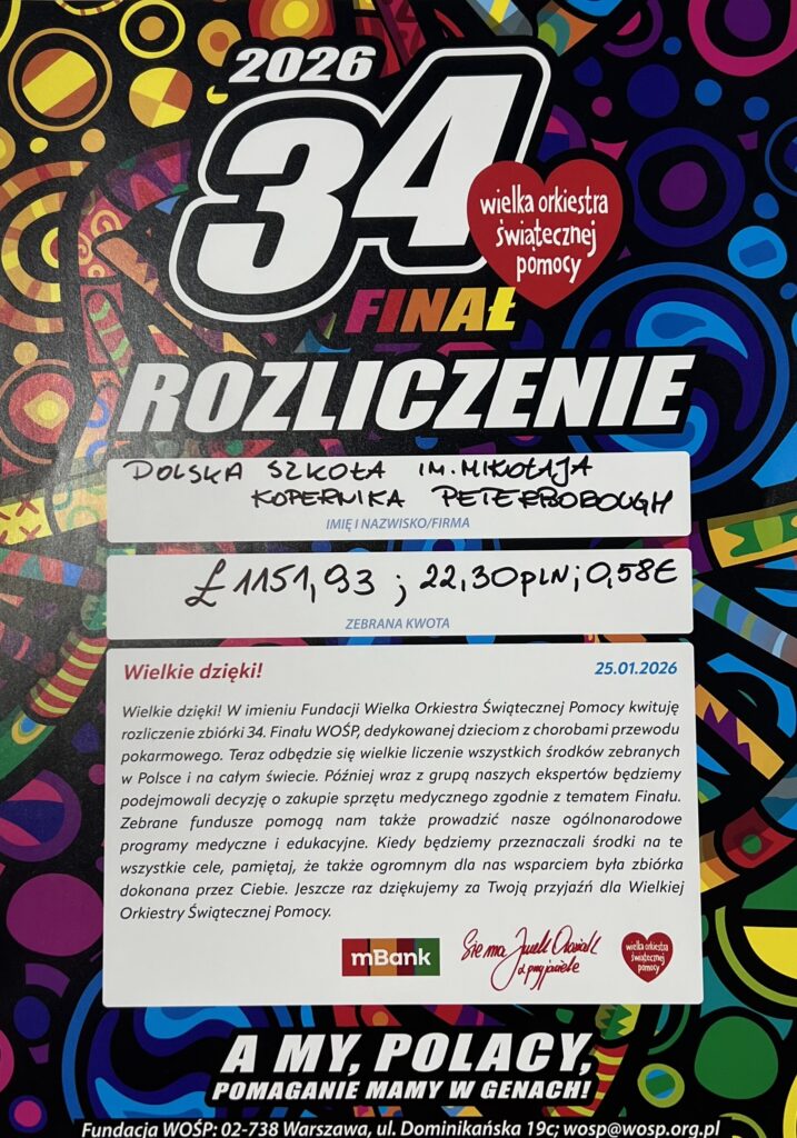 WOŚP #PolskaSzkołaPeterborough #GramyRazem #Dziękujemy💙