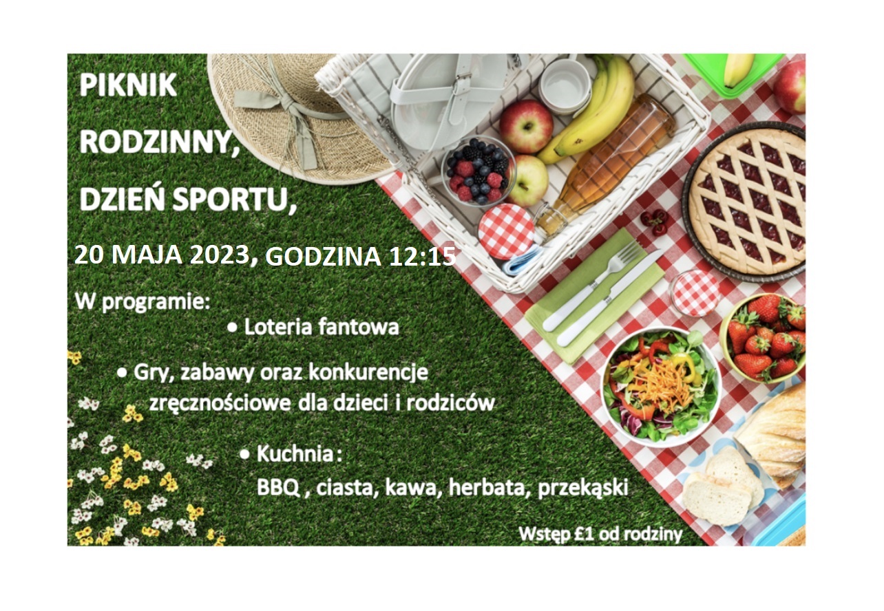 Serdecznie zapraszamy na organizowany w sobotę 20 maja 2023 Piknik Rodzinny połączony z Dniem Sportu oraz dniem otwartym. Pośród licznych atrakcji między innymi loteria fantowa, gry, zabawy i konkurencje zręcznościowe, BBQ, ciasta, kawa, herbata,przekąski. Impreza rozpocznie się o godzinie 12:15 na boisku trawiastym, wstęp £1 od rodziny. Prosimy, aby przynieść ze sobą koce, na których będzie można usiąść i w gronie najbliższych miło spędzić czas.