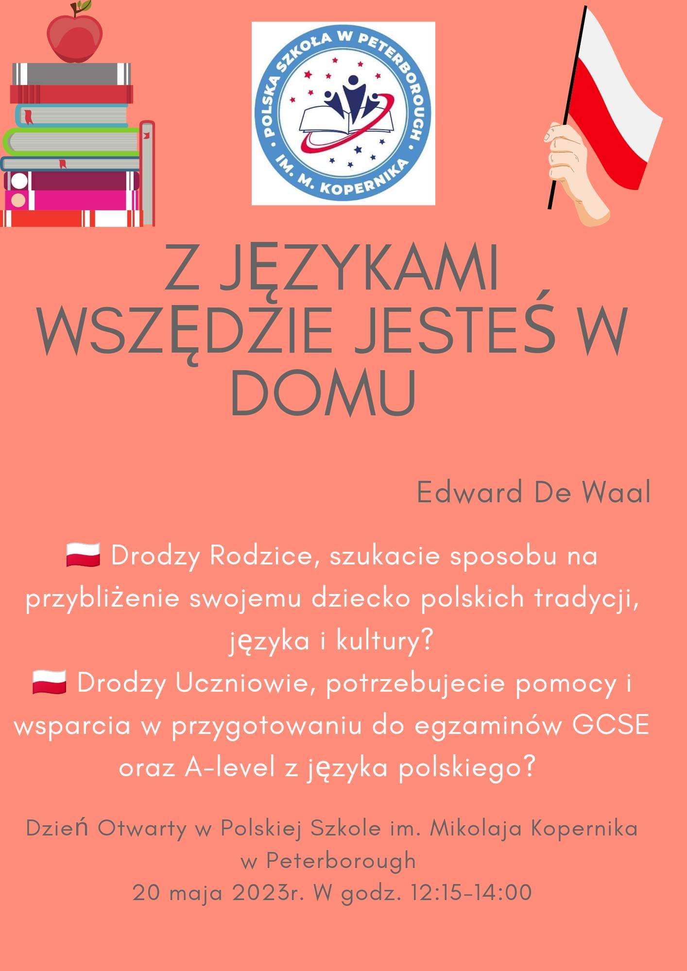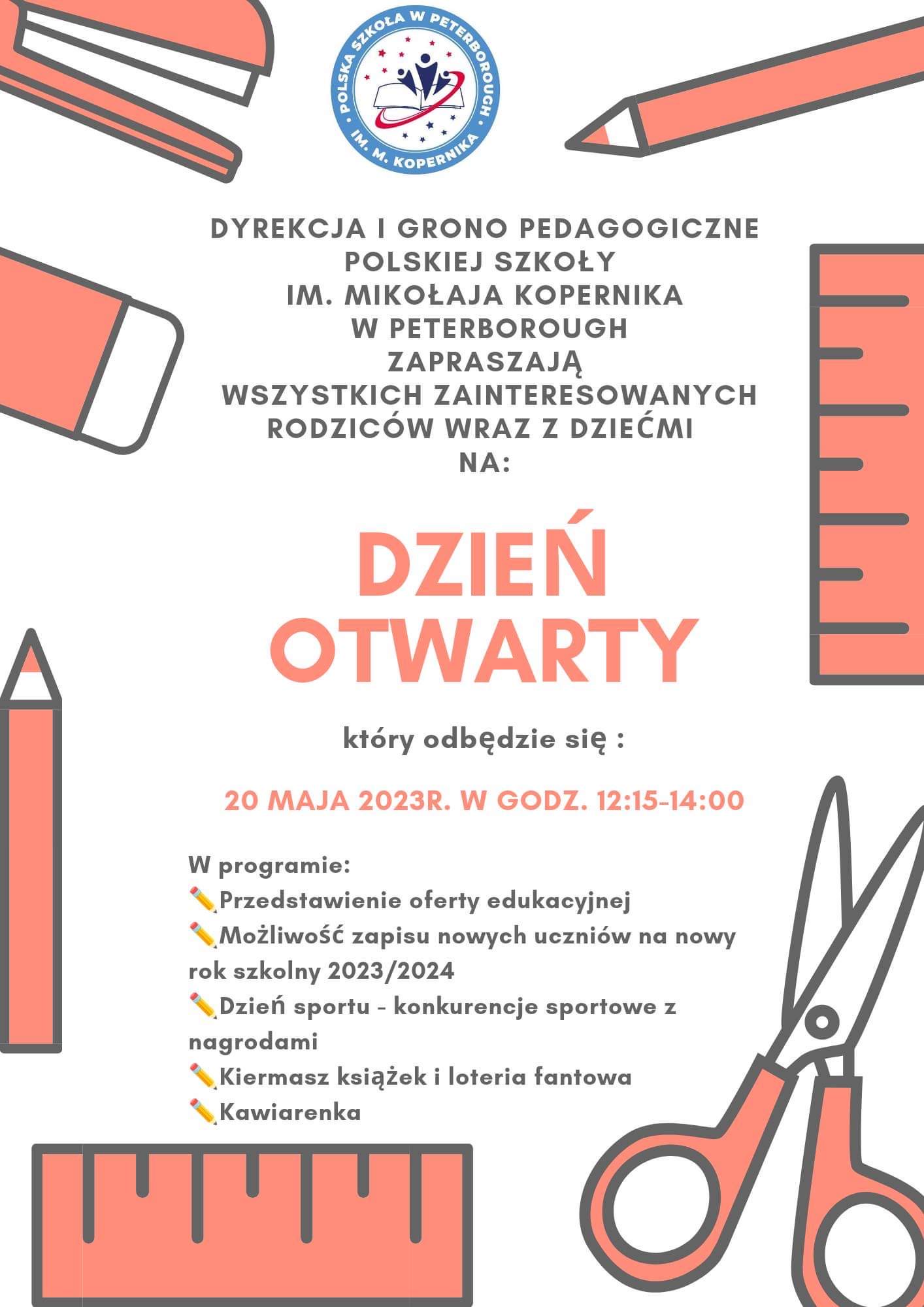 Informujemy, że w sobotę 20/05/2023 o godzinie 9:00 w auli szkoły St. John Fisher Catholic High School odbędzie się Walne Zebranie Polskiej Szkoły w Peterborough im. Mikołaja Kopernika.