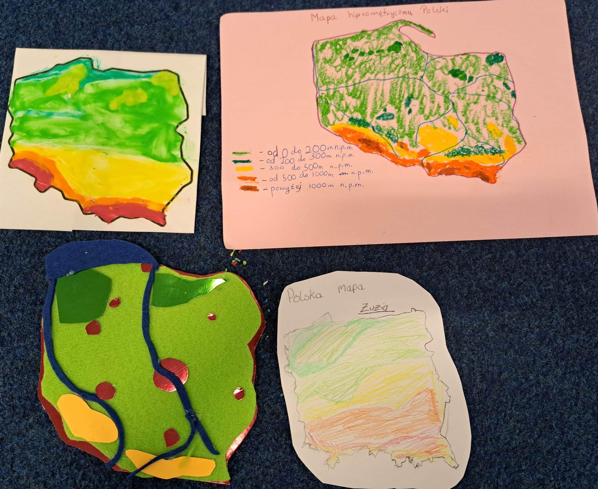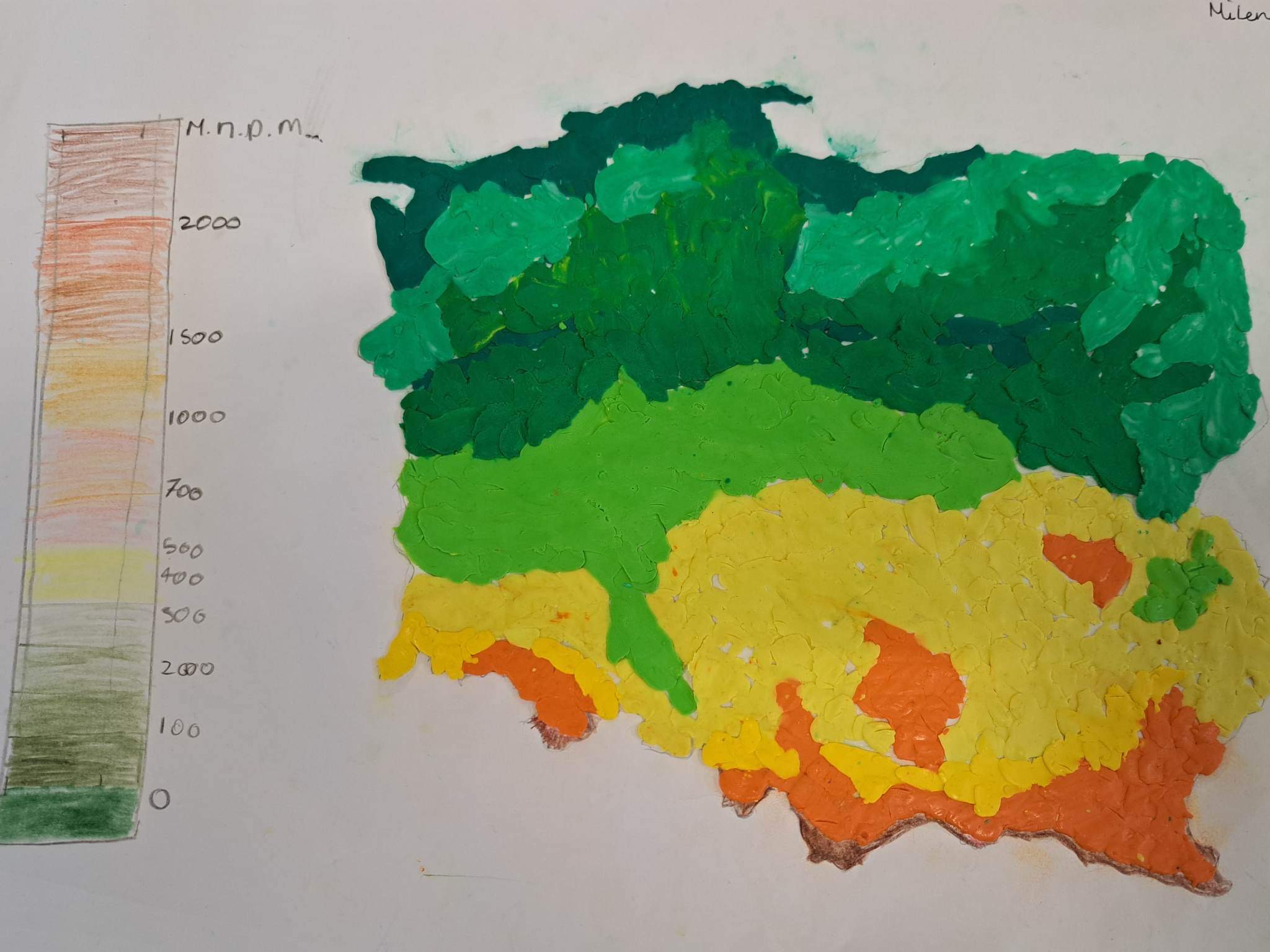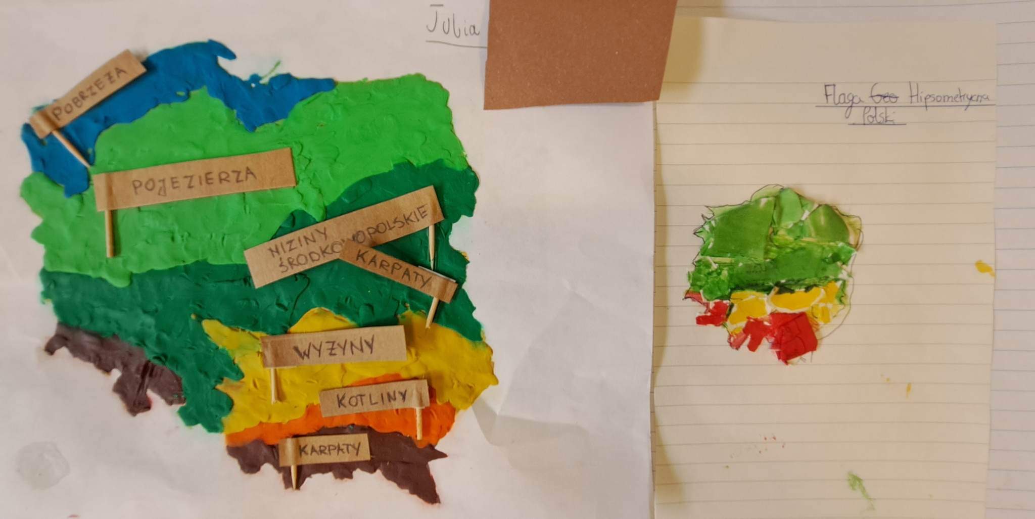 Niezwykle uzdolnieni uczniowie klas 6stych przygotowali na lekcje geografii mapy hipsometryczne Polski ukazujace pasmowy uklad rzezby: pas pobrzezy, pojezierzy, nizin srodkowopolskich, wyzyn, kotlin oraz gor. Na uwage zasluguje kreatywnosc uczniow i roznorodnosc technik uzytych do przygotowania tych fantastycznych prac.