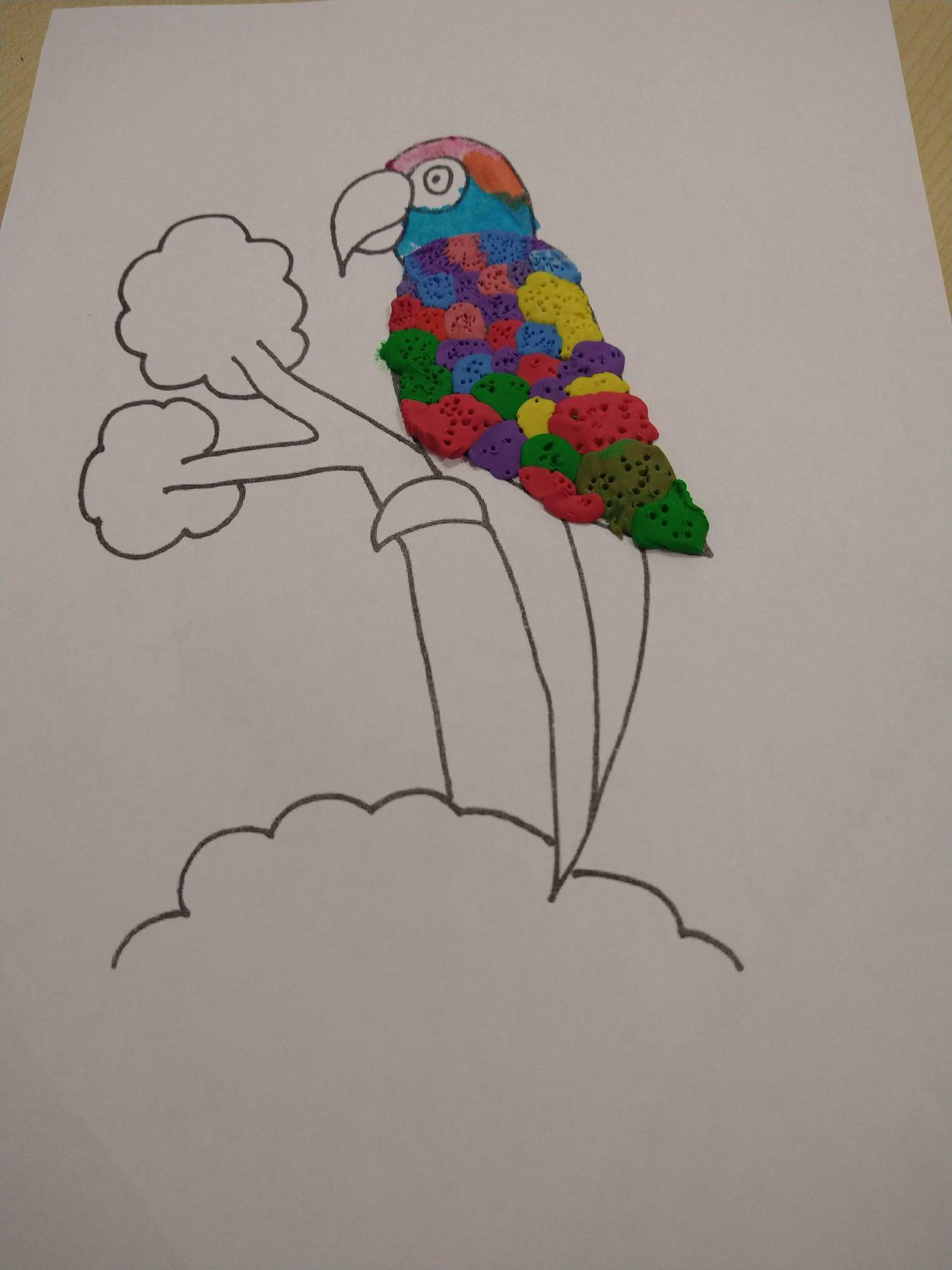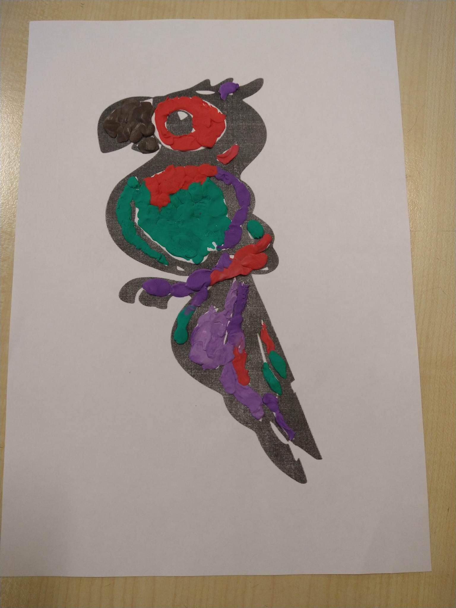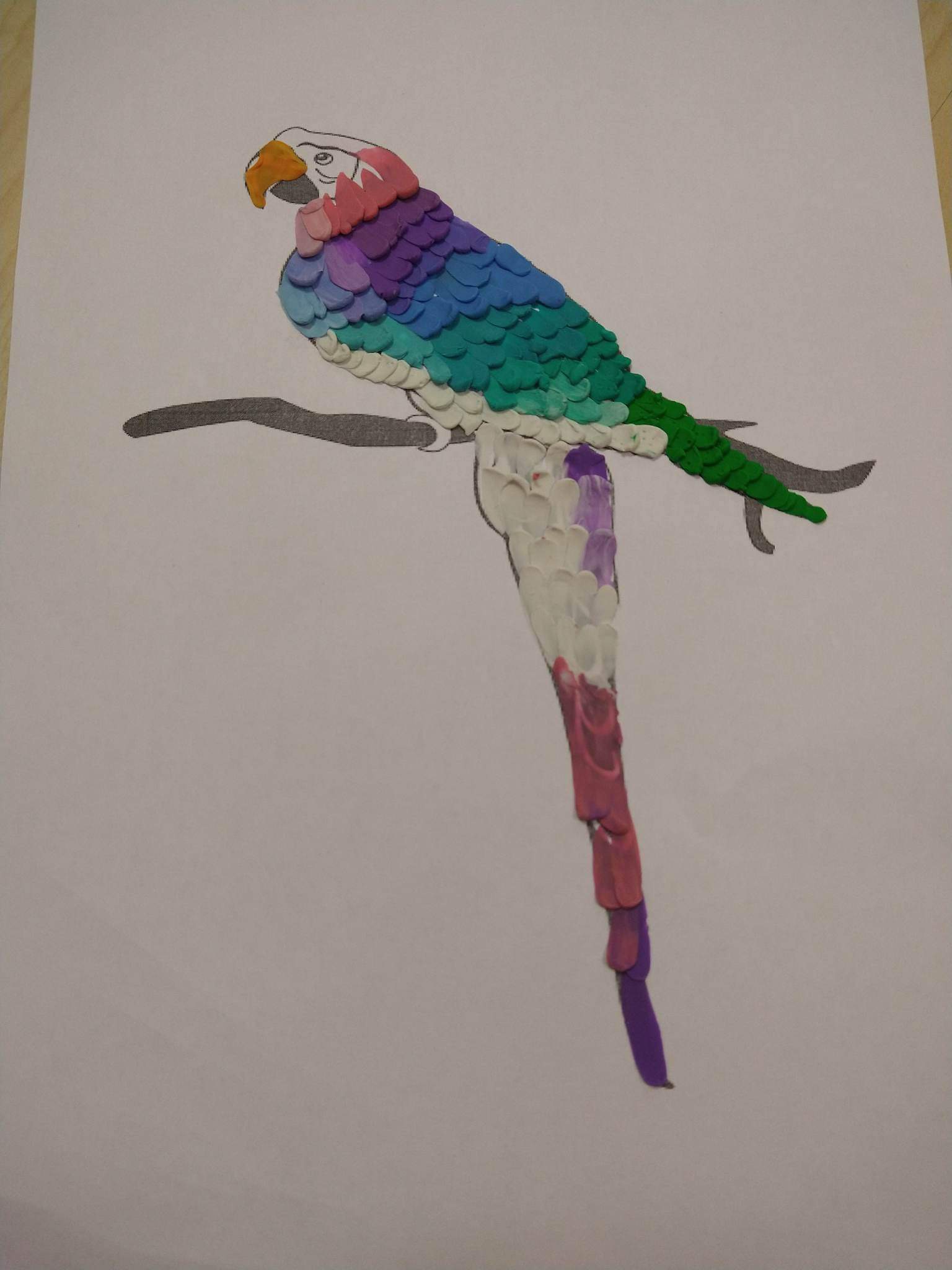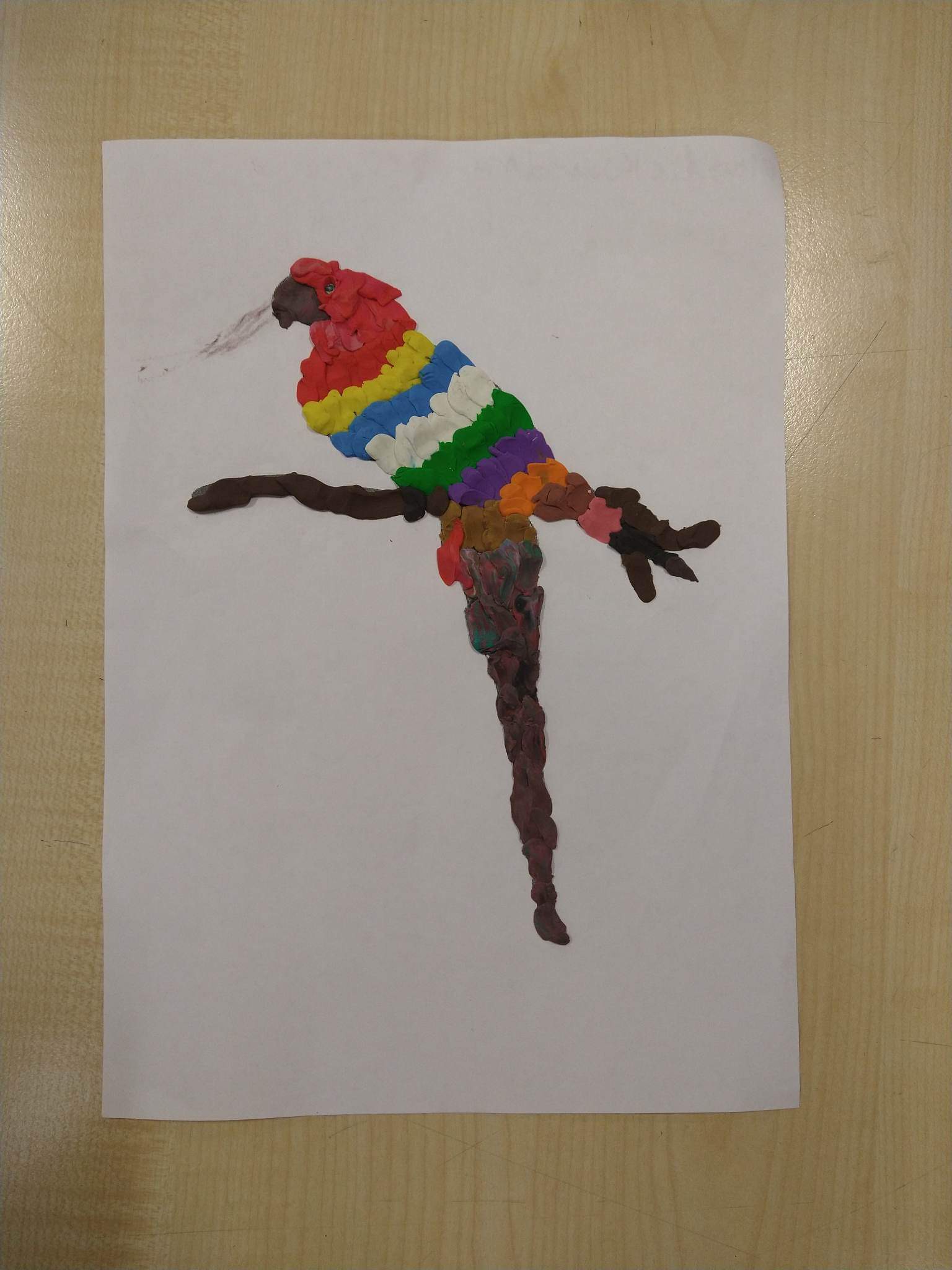 Uczniowie starszej grupy plastycznej- zgodnie z przyjᶒtą nazwą “ubrali” swoje papugi w piᶒkne, barwne, plastelinowe piόrka.