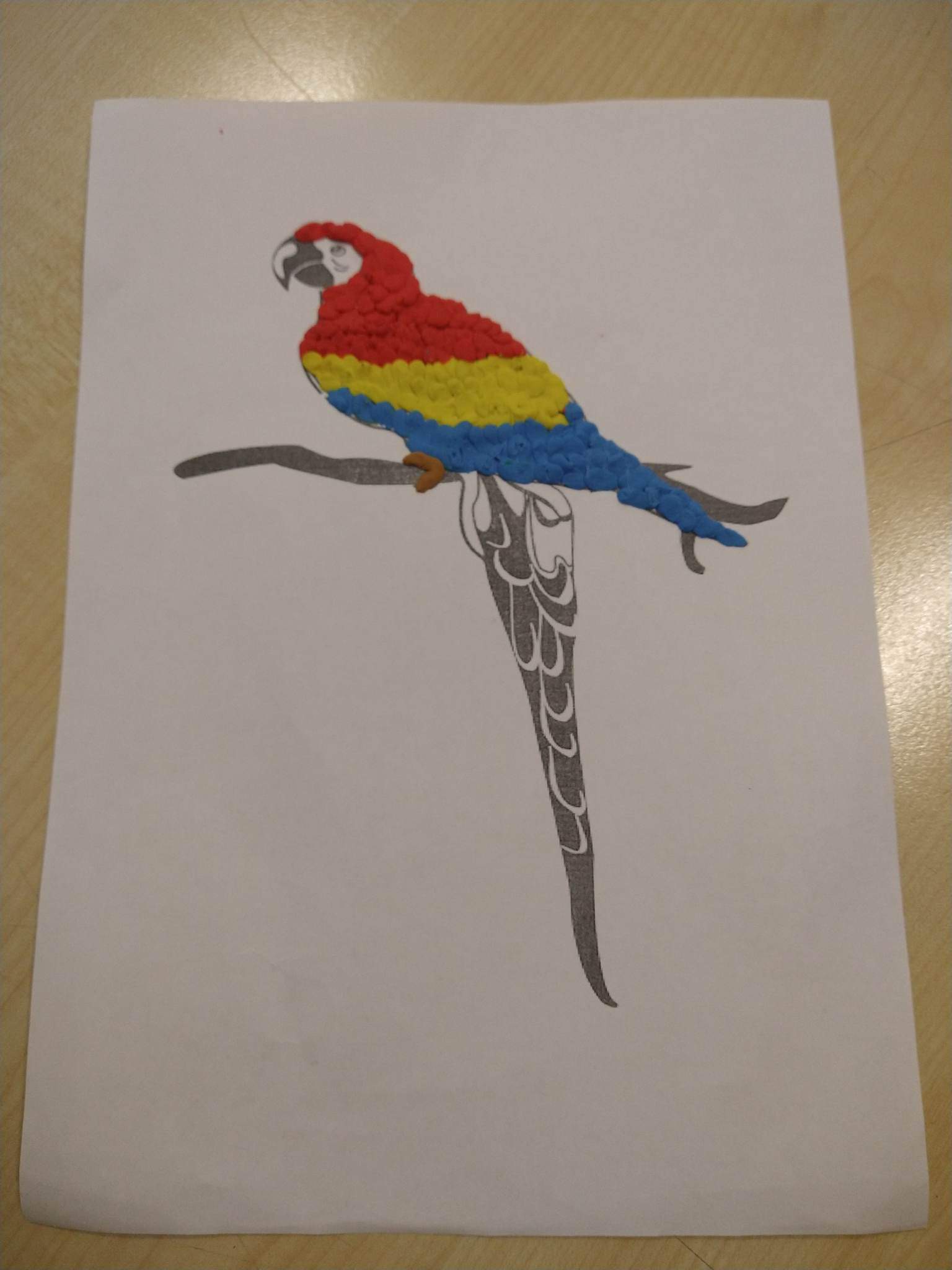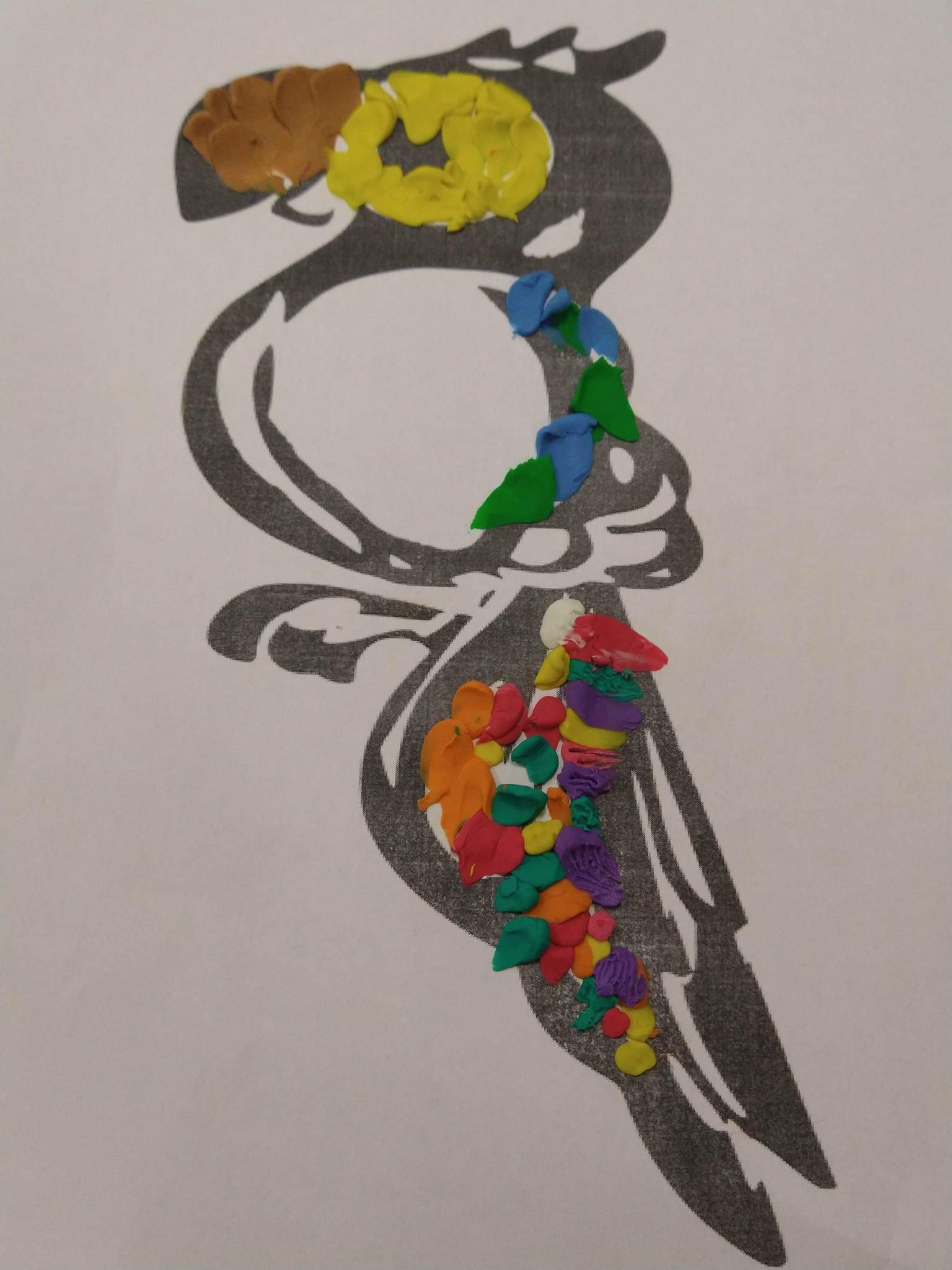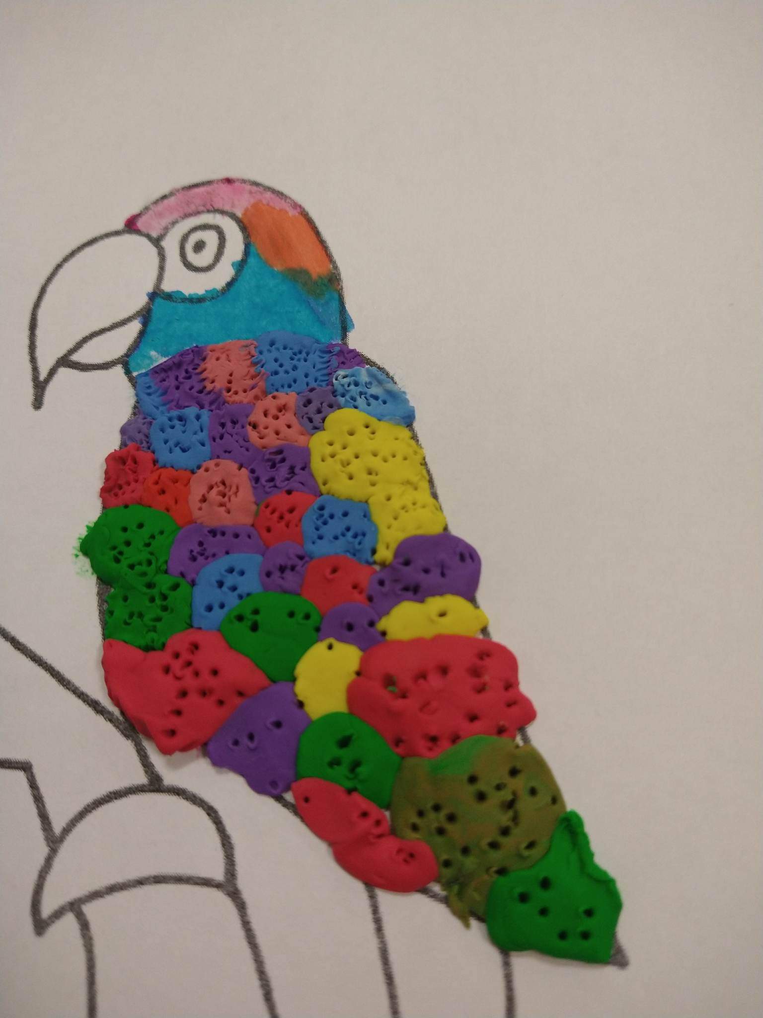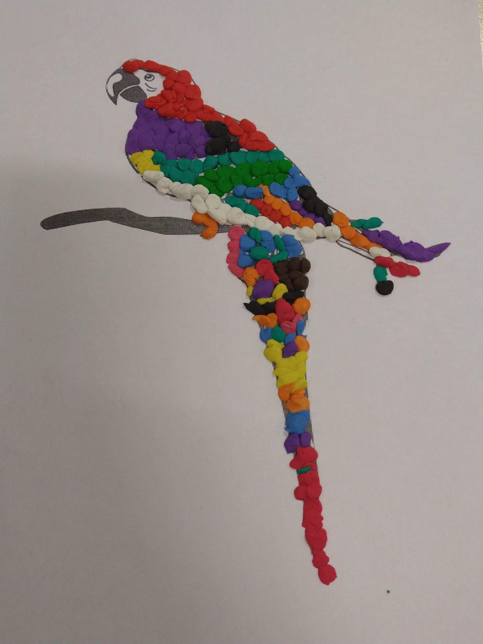 Uczniowie starszej grupy plastycznej- zgodnie z przyjᶒtą nazwą “ubrali” swoje papugi w piᶒkne, barwne, plastelinowe piόrka.