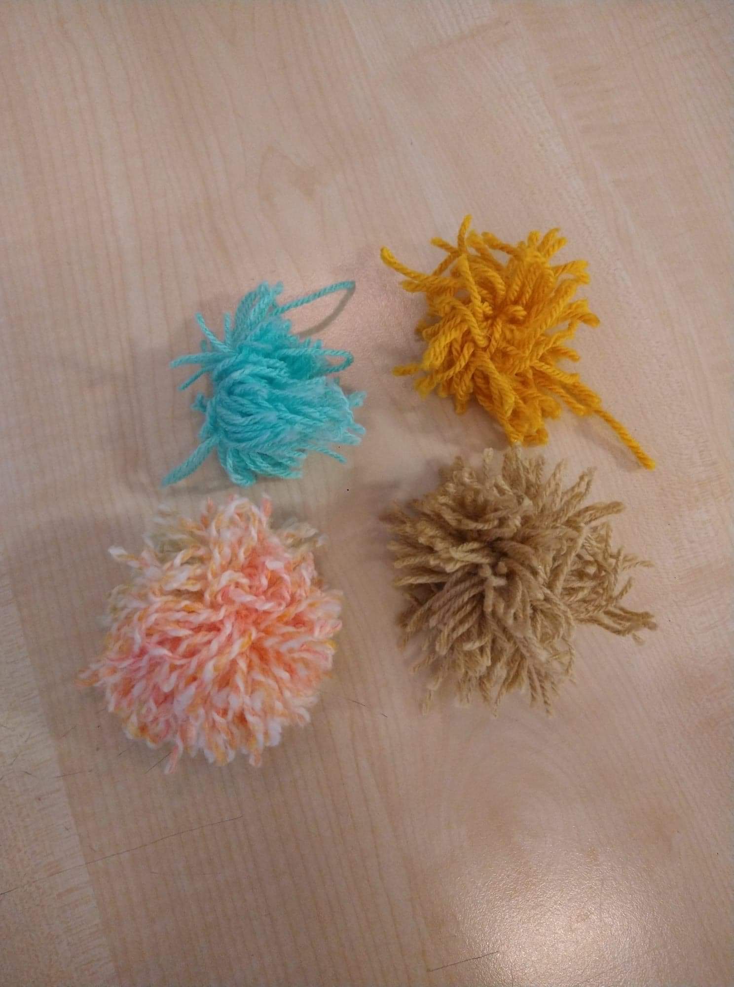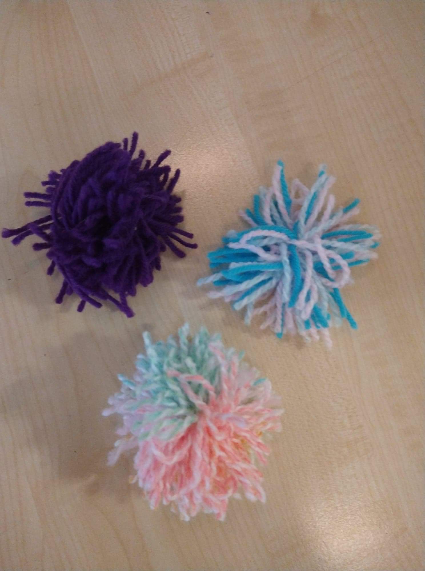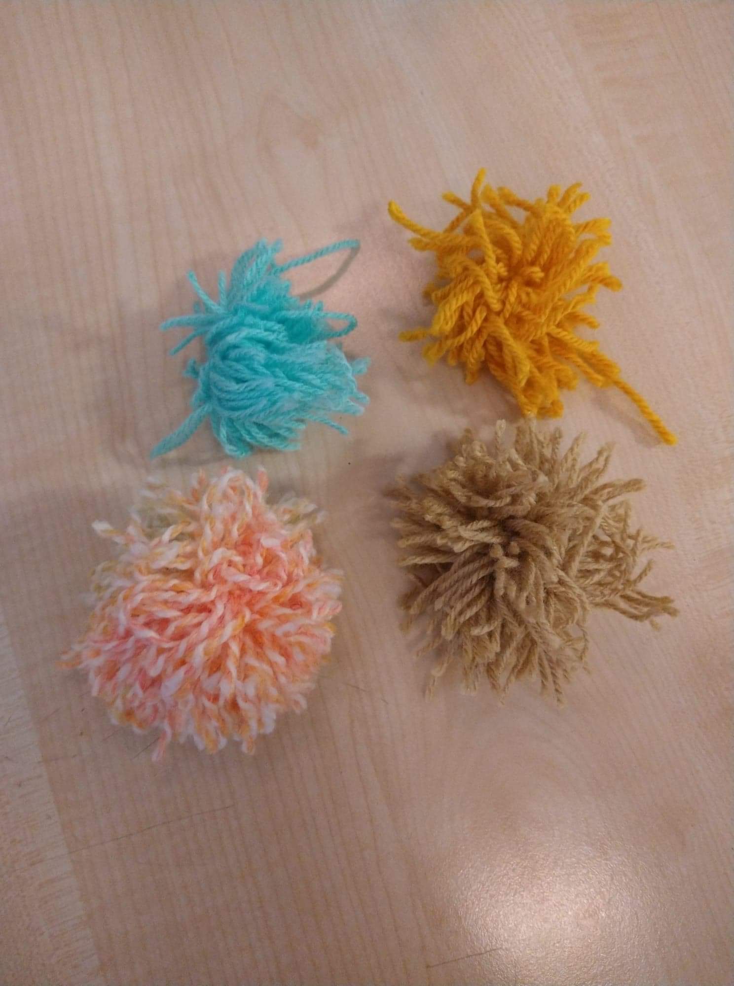 W styczniu na zajęciach grupy „Złote ołówki” pompony wykorzystując włóczkę.