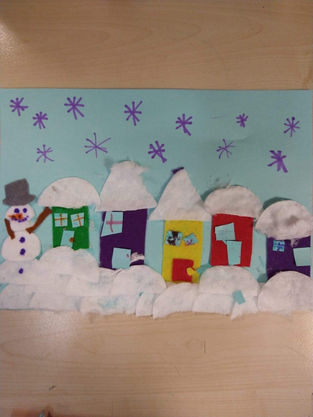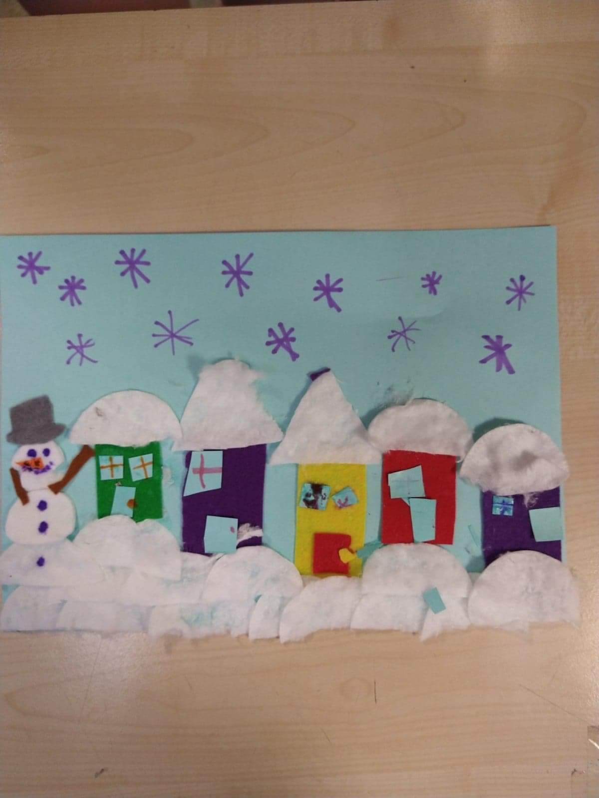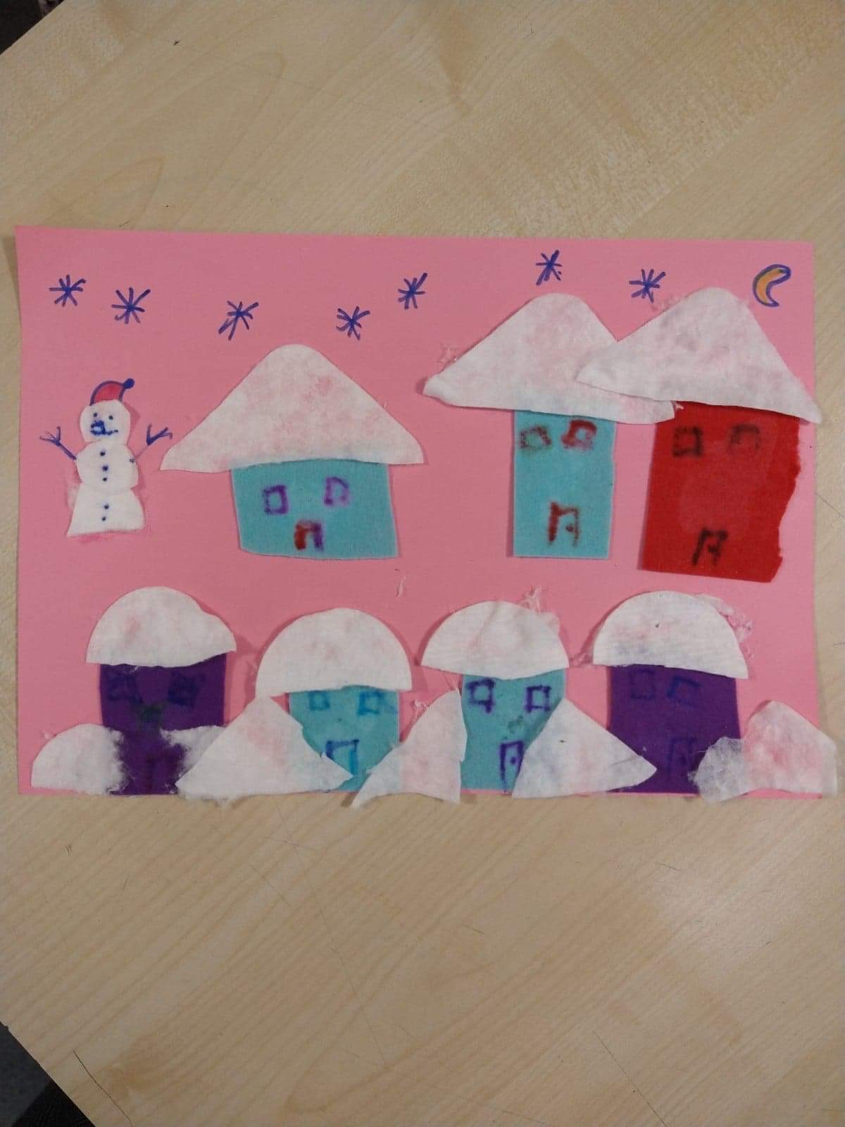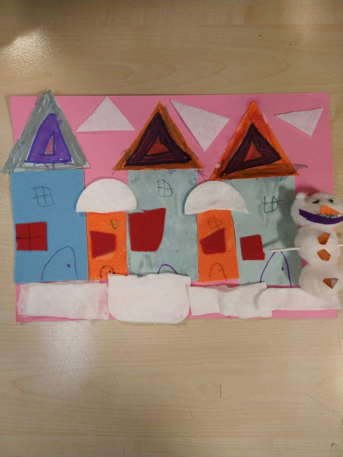 Grupa „Złote Ołówki” w styczniu wykonała piękne prace zimowe domki korzystając z papieru kolorowego filcu, waty i płatków kosmetycznych.