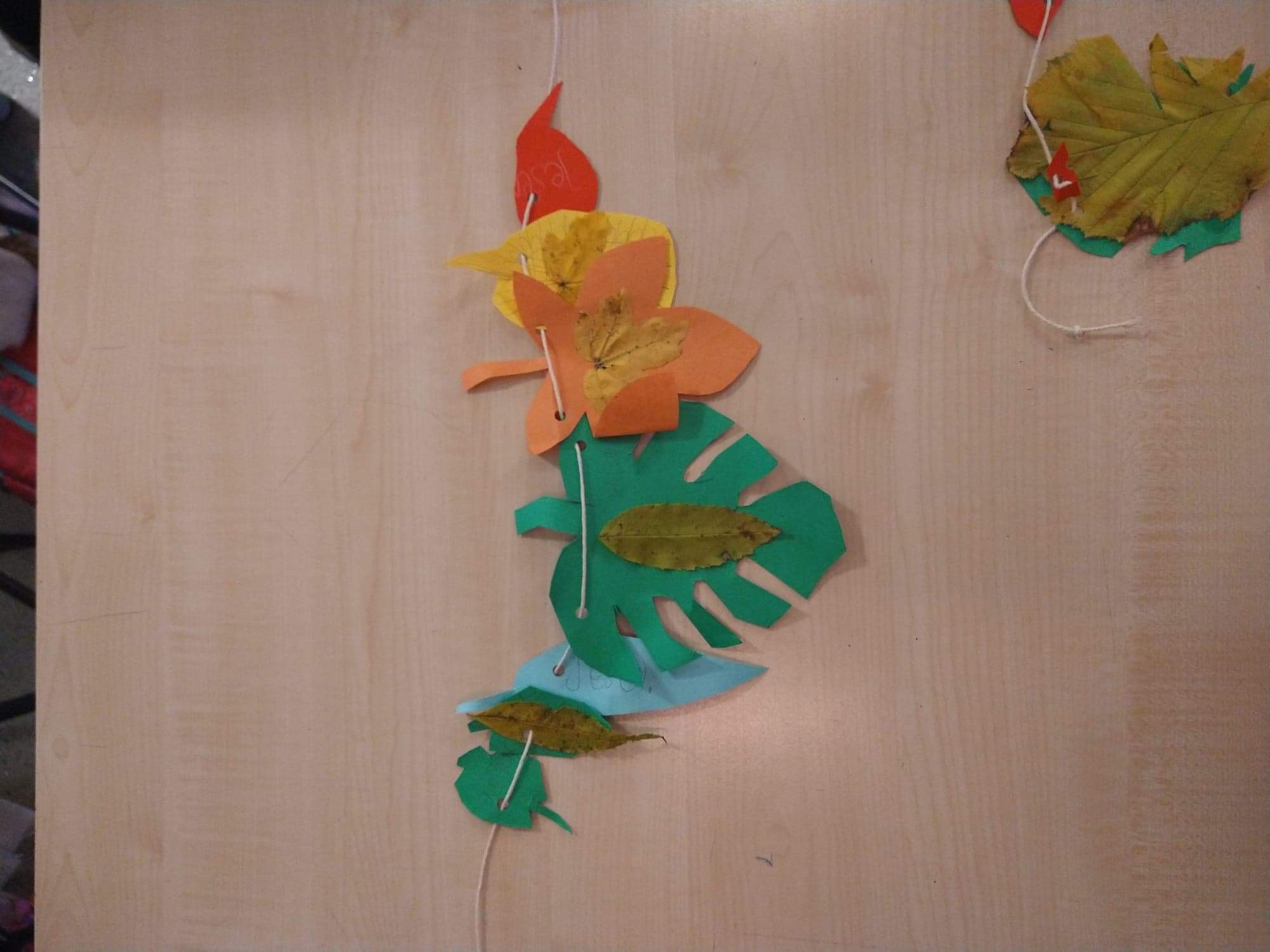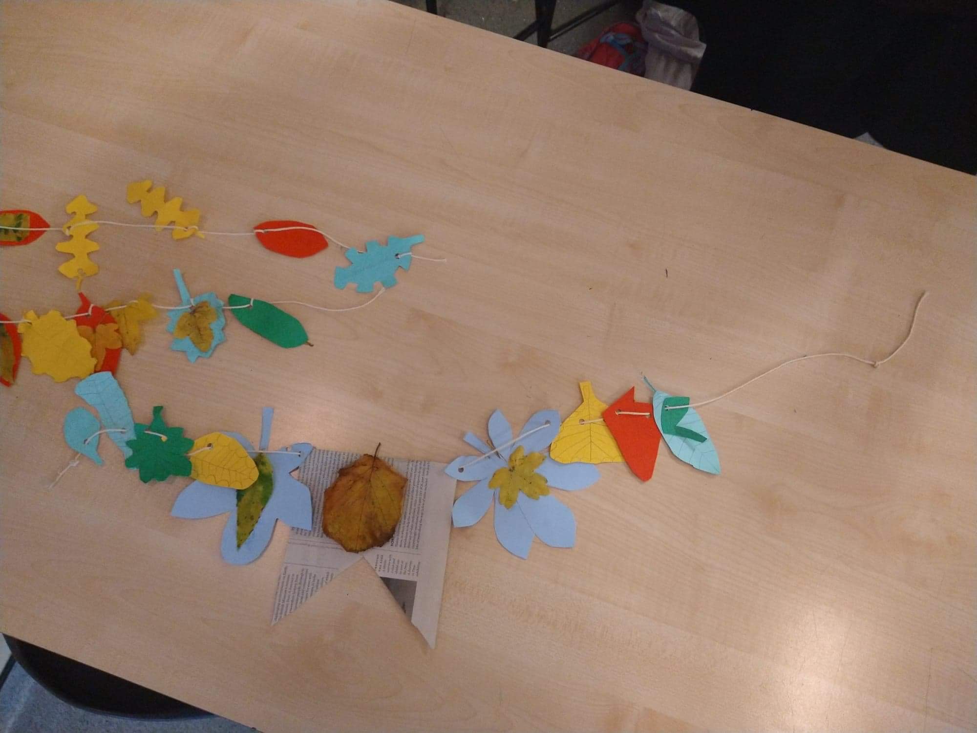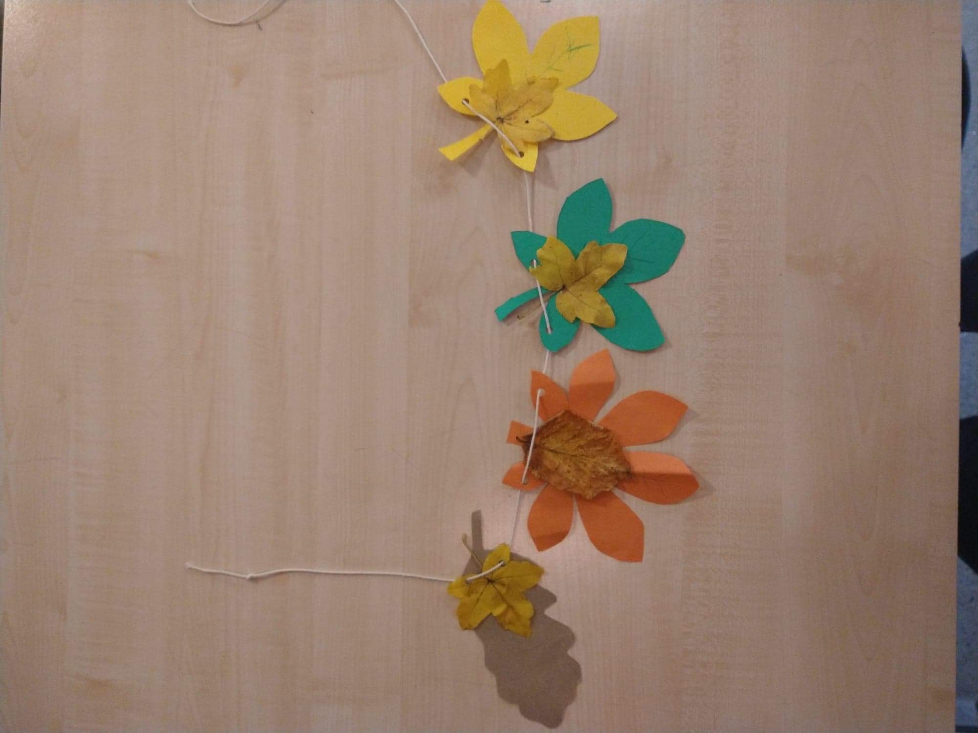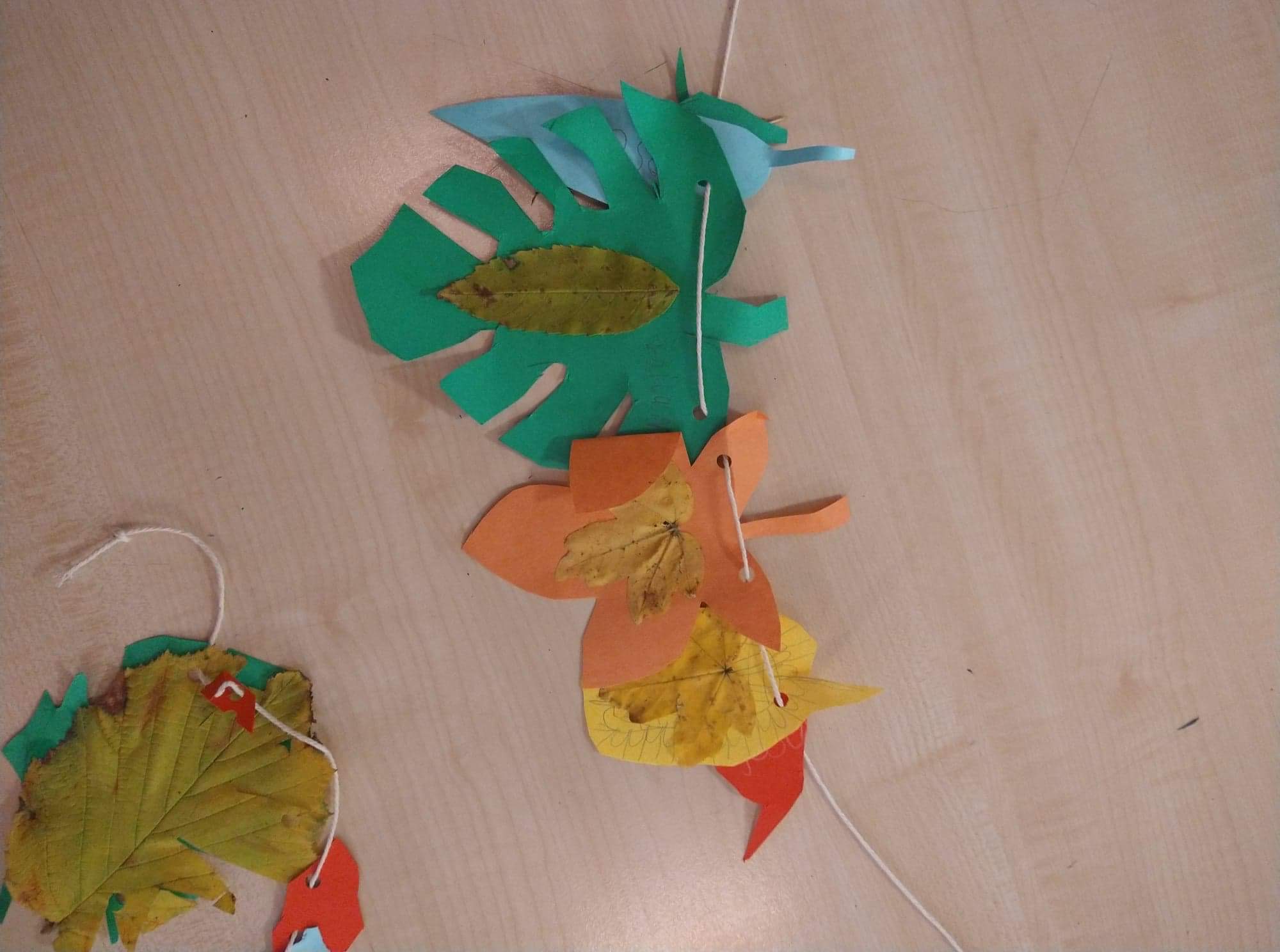 Jesienna girlanda wykonana z grupa „Złote Ołówki” wykorzystują dary jesieni: liście papier i naturalny sznurek.