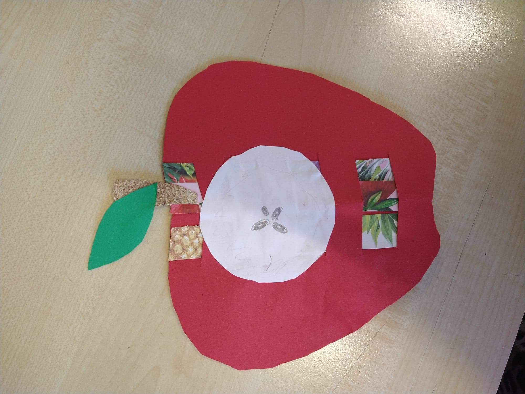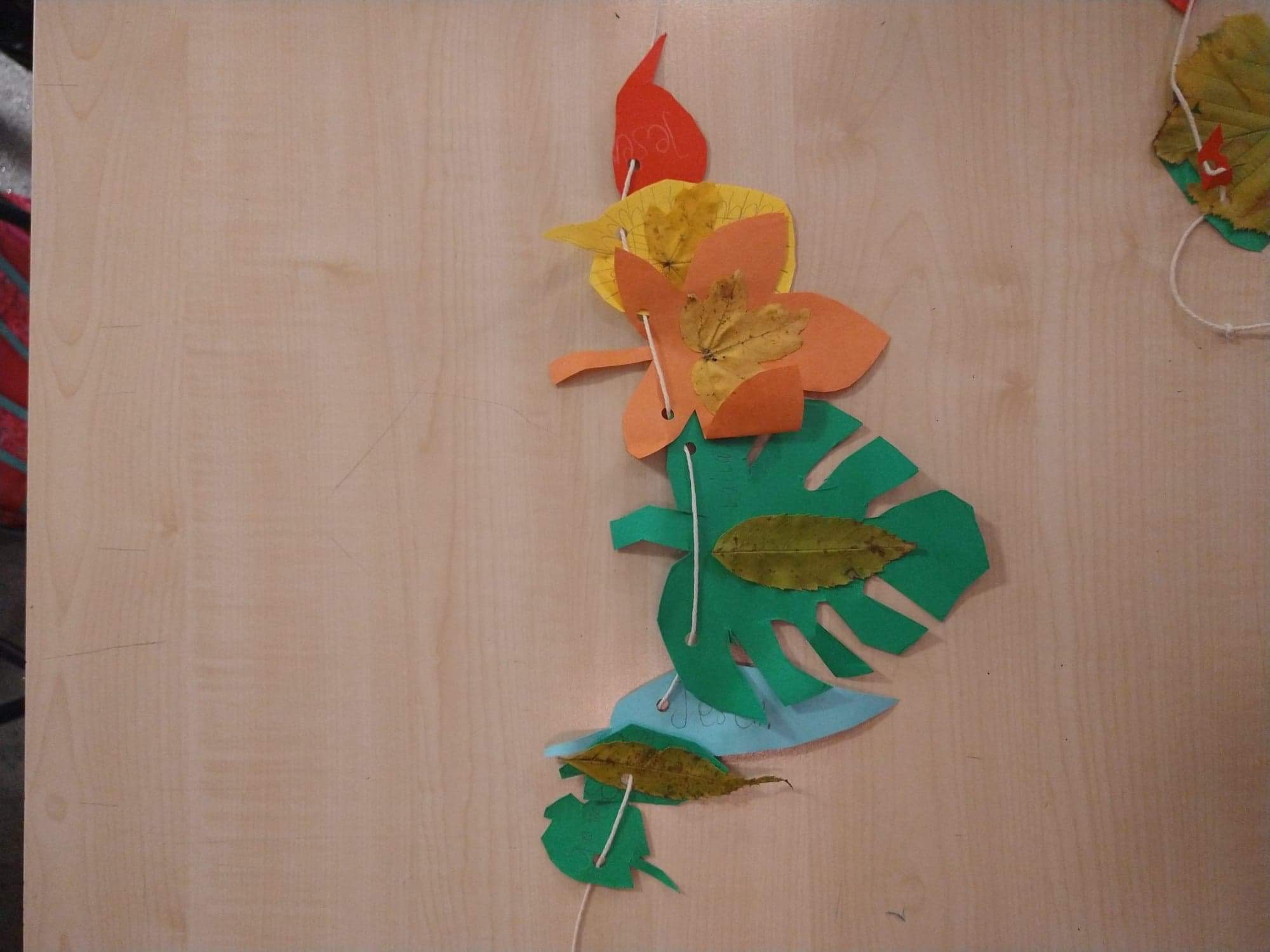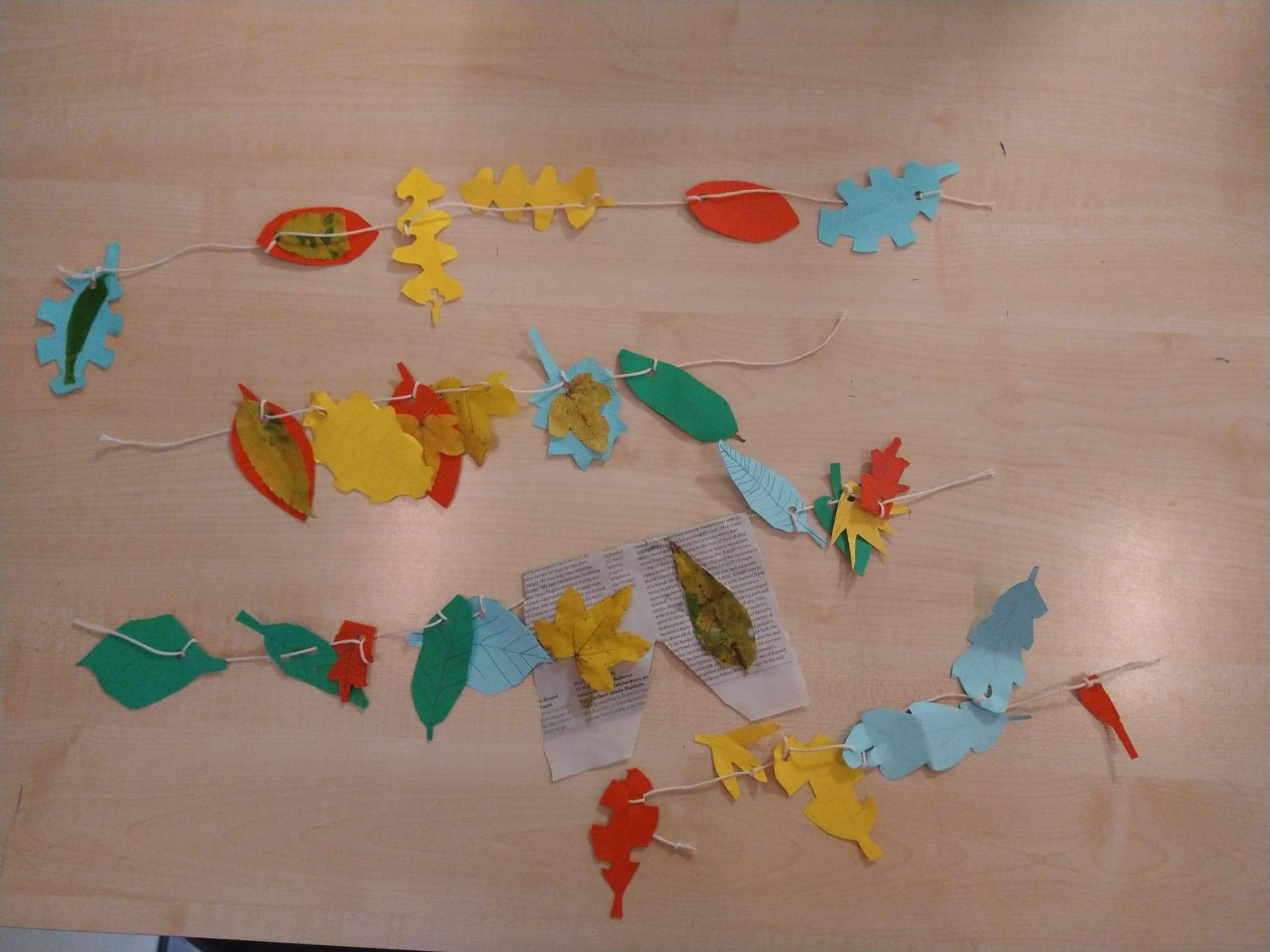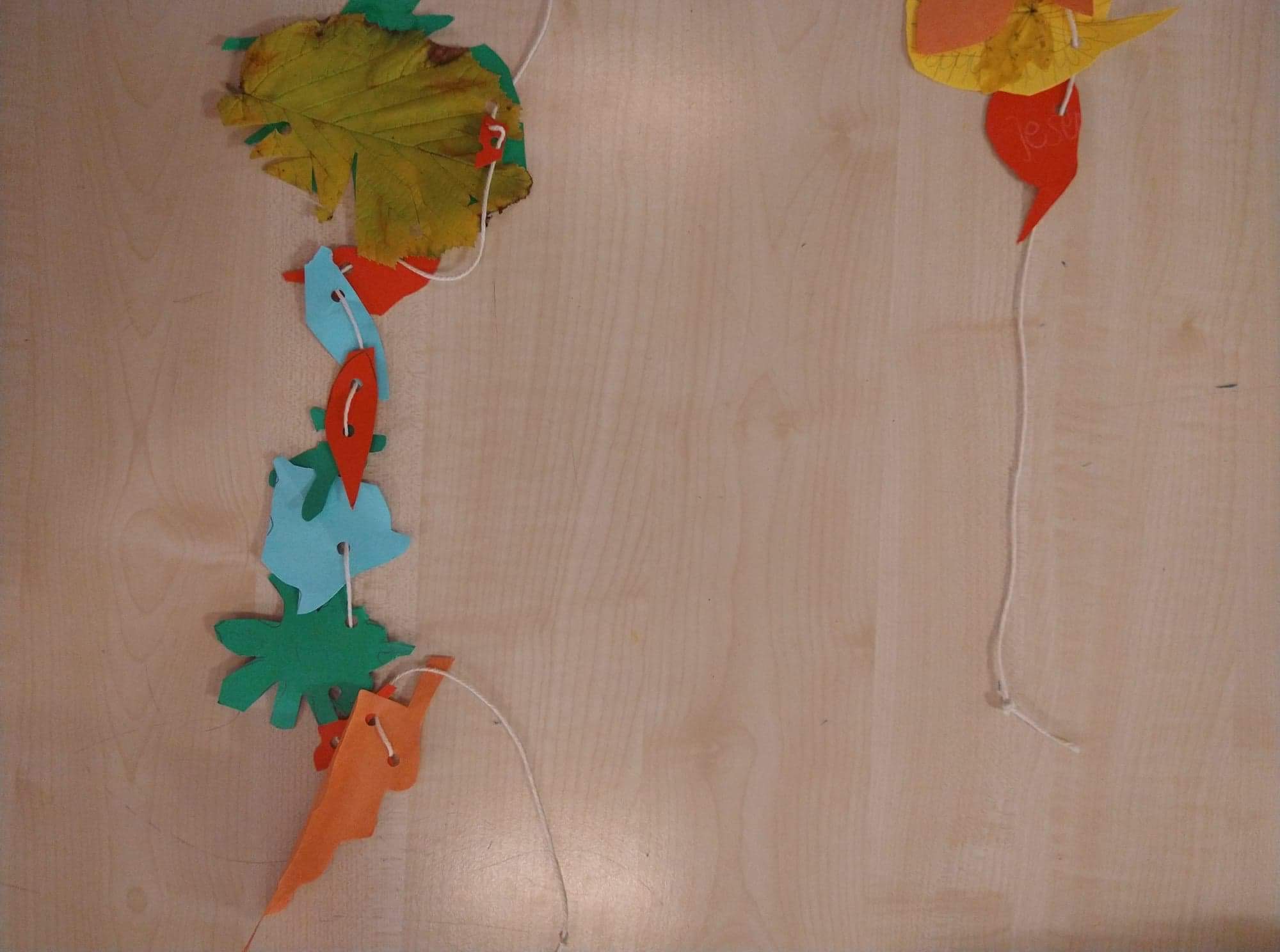 Jesienna girlanda wykonana z grupa „Złote Ołówki” wykorzystują dary jesieni: liście papier i naturalny sznurek.