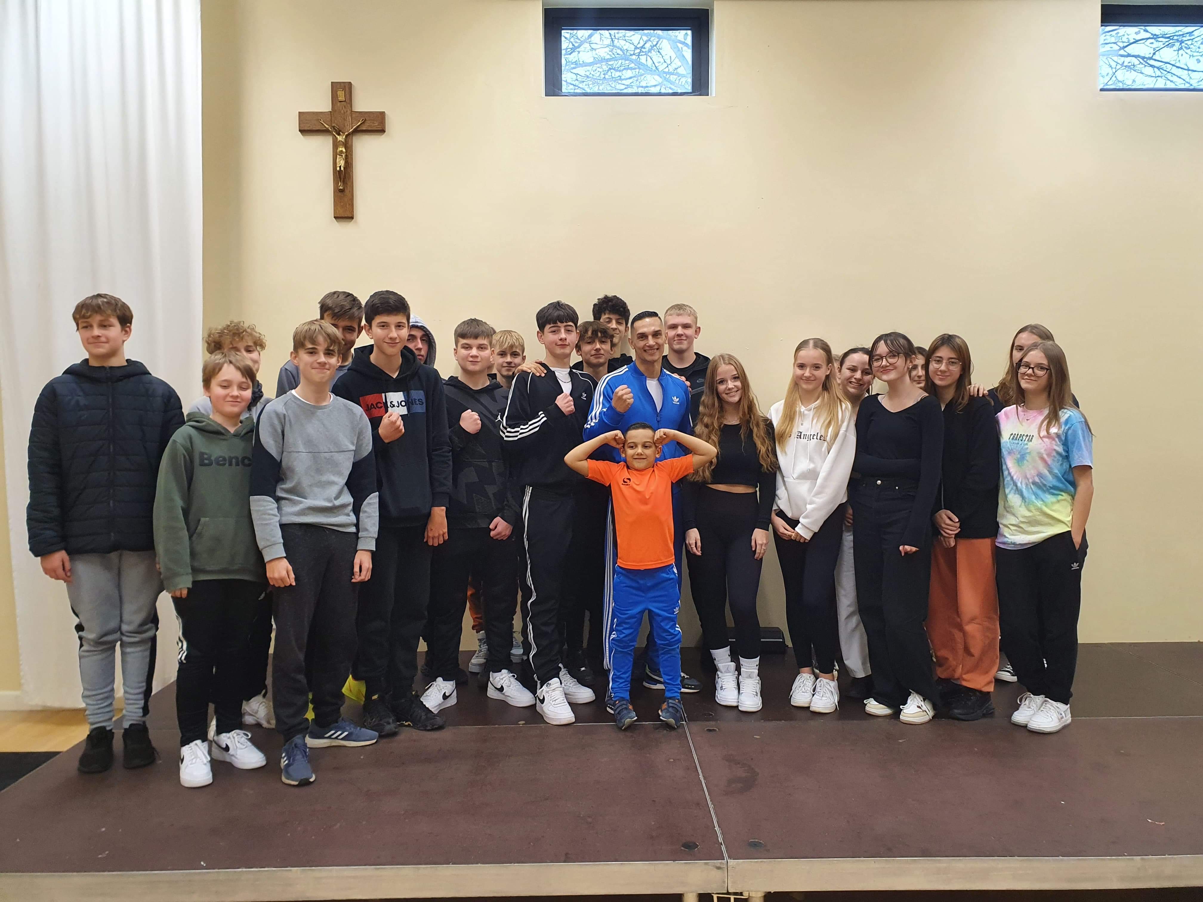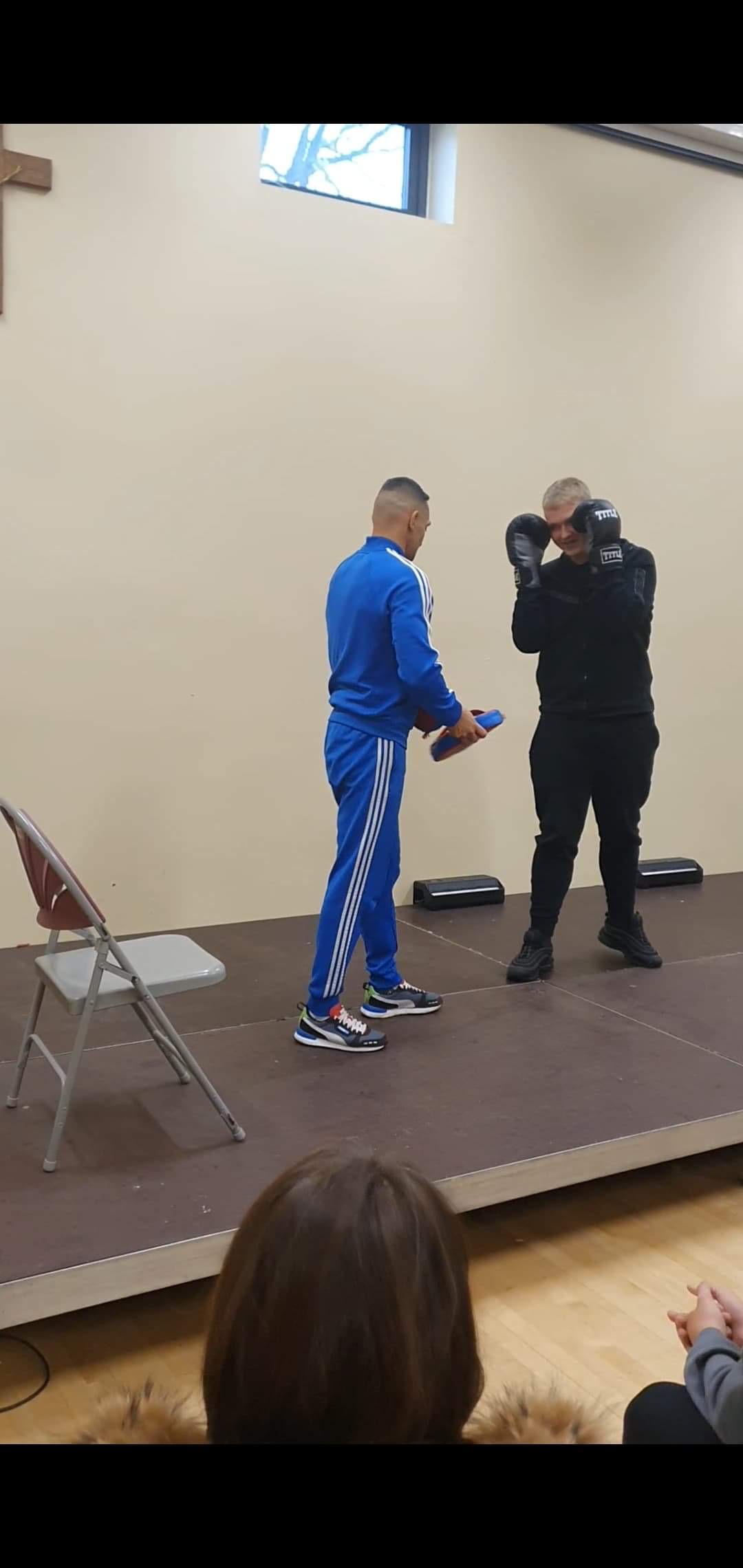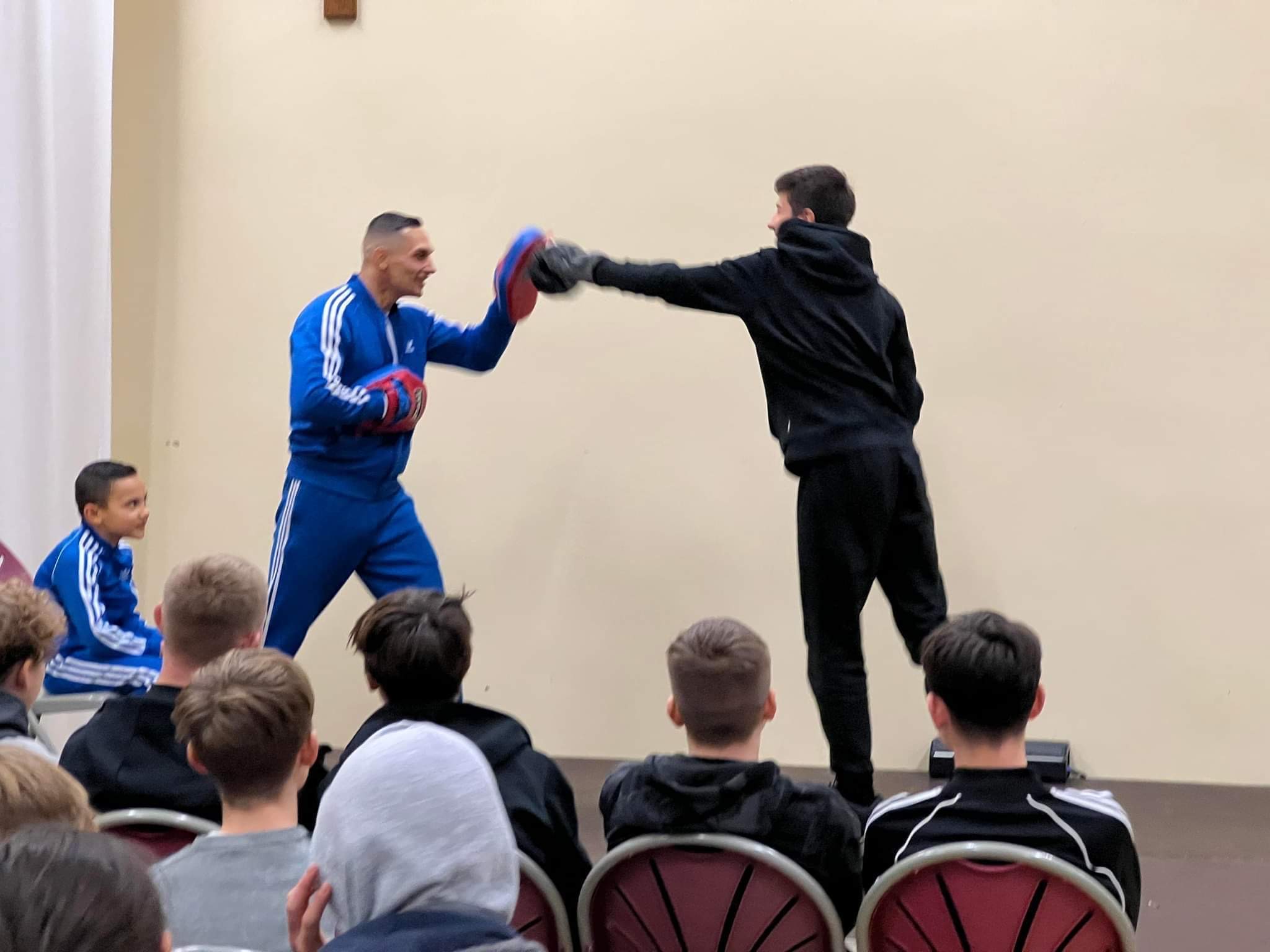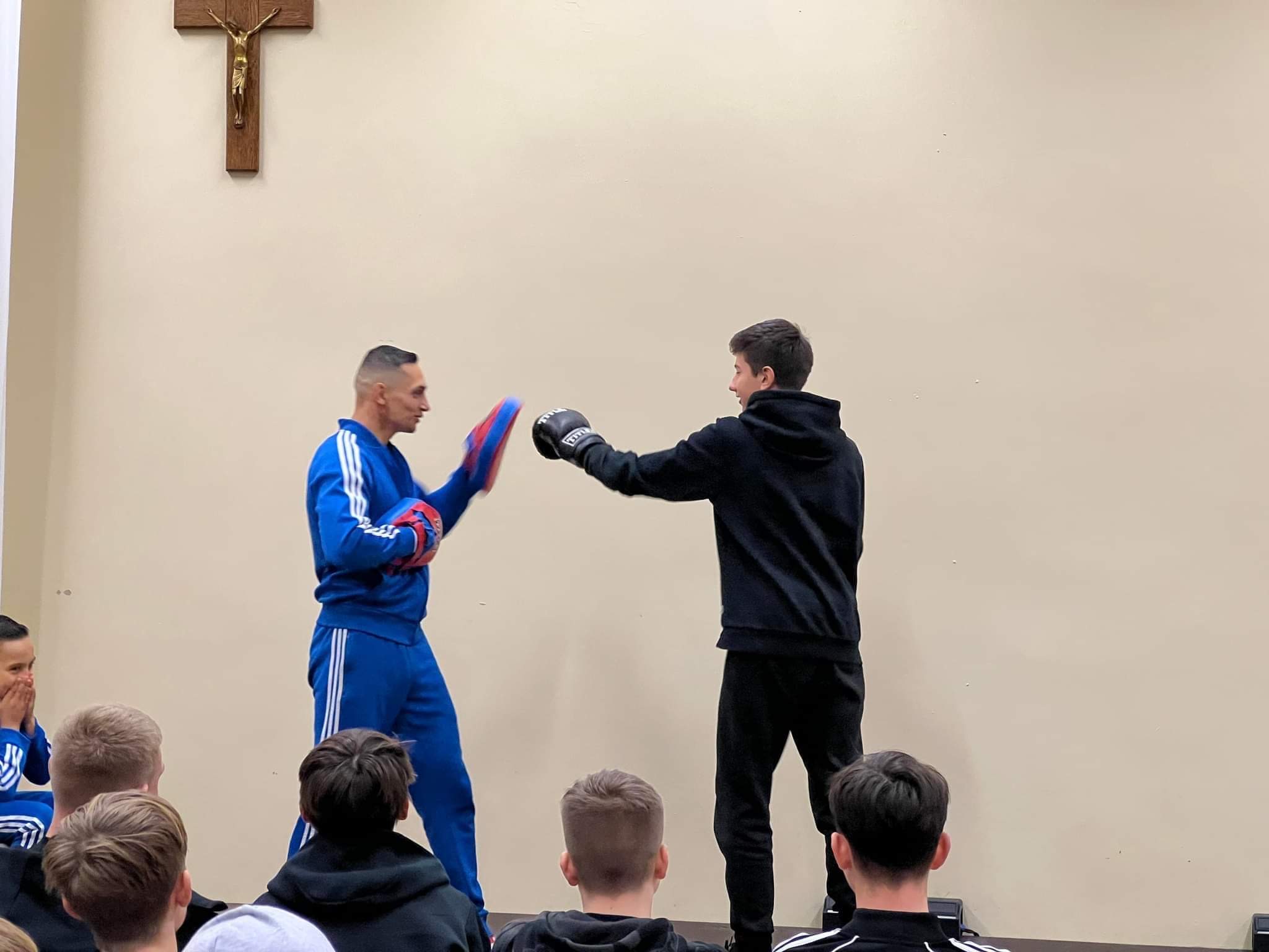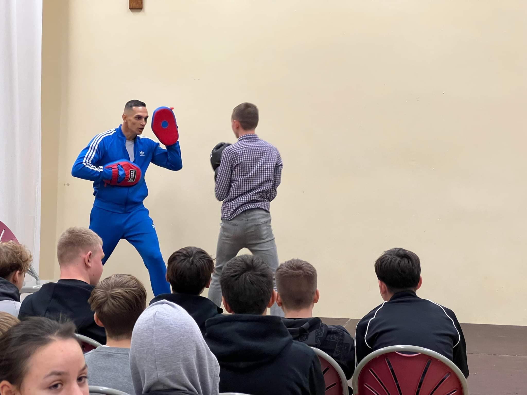 19 listopada 2022 roku 10 i 9 klasy miały zaszczyt gościc Łukasza Olszowskiego i jego synka Oliviera. Łukasz jest trenerem personalnym a jego dyscyplina sportowa to Kick boxing i muay thai 🥊. Rozpoczęliśmy wywiadem, który przeprowadziła pani Bernardetta Chmielewska z pomocą pań Katarzyny Niemkiewicz-Borowicz i Iwony Drummond. Następnie uczniowie mieli szansę na zadanie kilku pytań naszemu gościowi a potem już była wyczekana przez uczniów część czyli prezentacja dyscypliny. Łukasz wraz z synem zademonstrował podstawowe ruchy po czym uczniowie mogli założyć rekawice i spróbować „poboksowac” ze sportowcem. Emilka Targańska z klasy 10 zademostwowala nam swoją pasję Tang Soo Do i razem z gościem poćwiczyli uderzenia. Spotkanie zakończyło się sesją zdjęciową, którą możecie państwo zobaczyć poniżej. Jeszcze raz wielkie brawa dla naszego gościa i jego synka Oliviera , Emilki Targańskiej i wszystkich uczniów, ktorzy mieli możliwość zademonstrować swoje zdolności bokserskie.