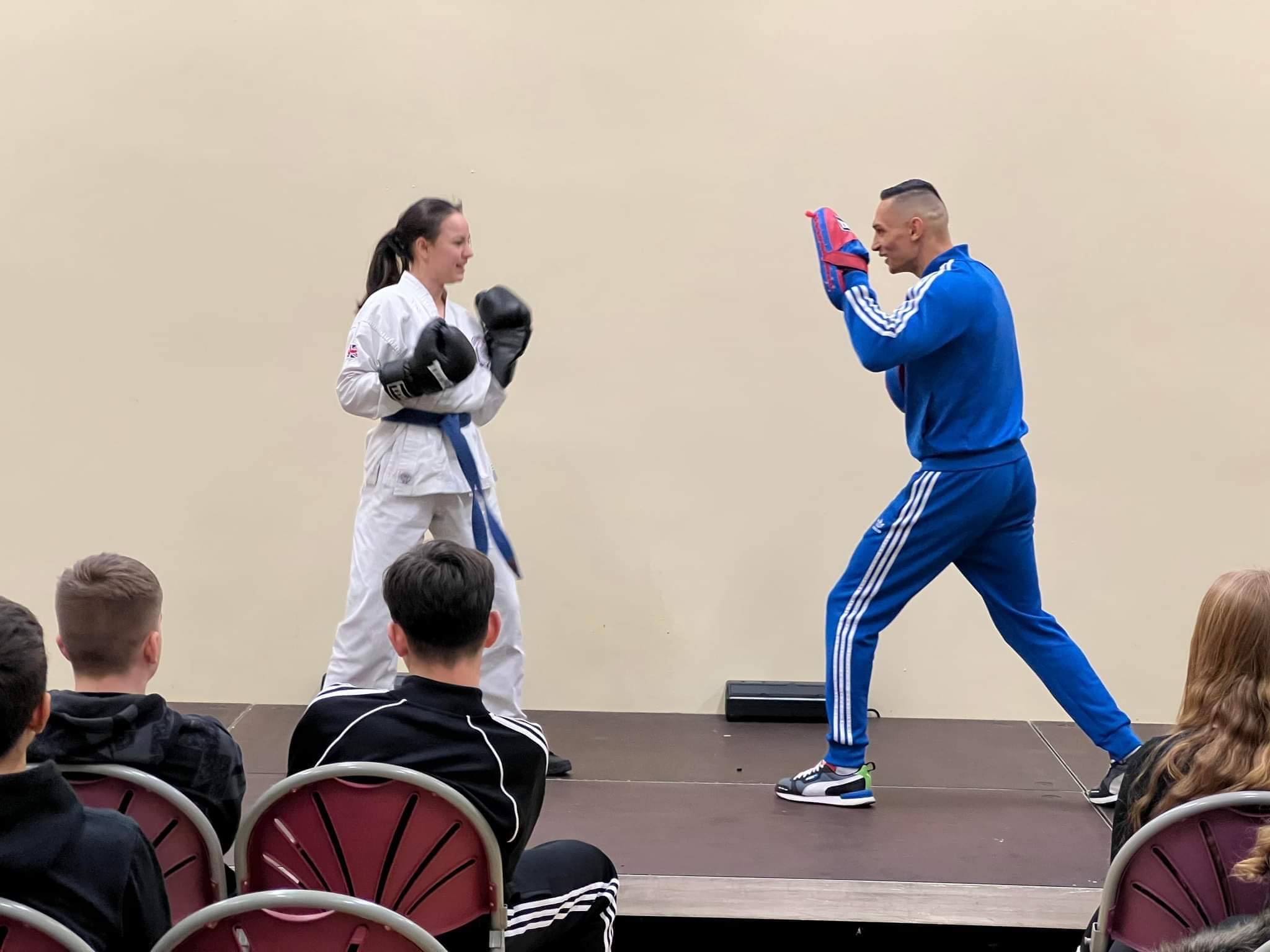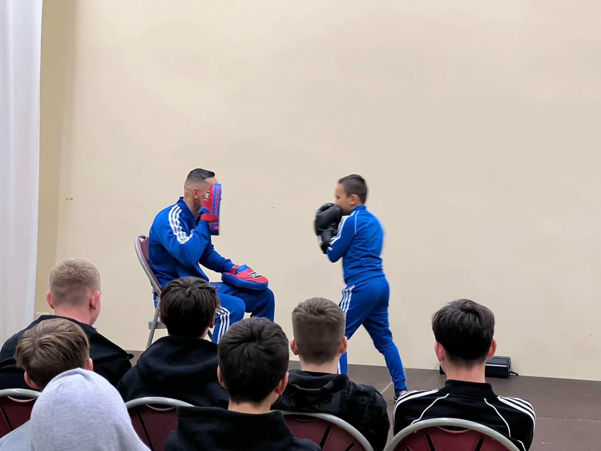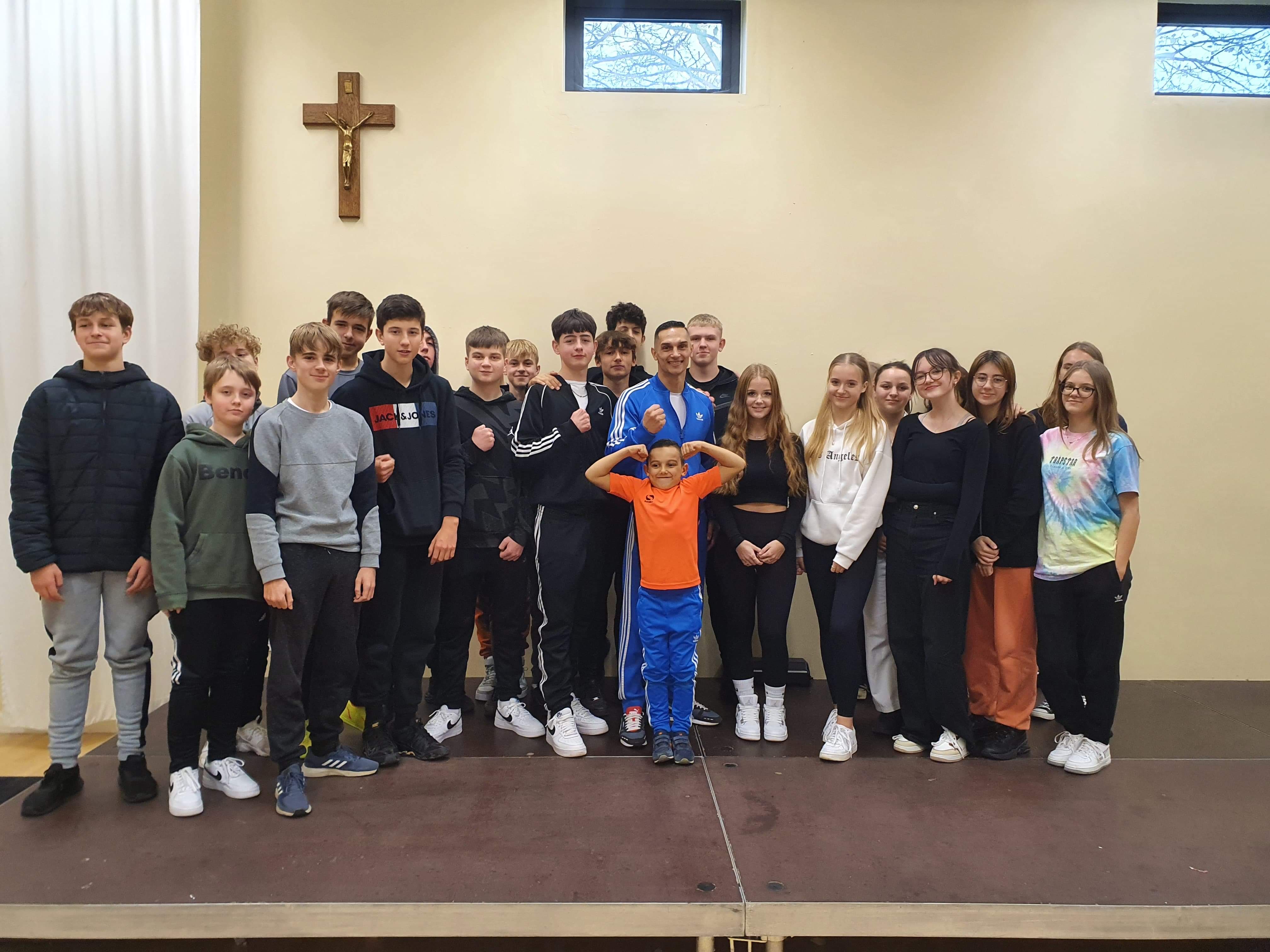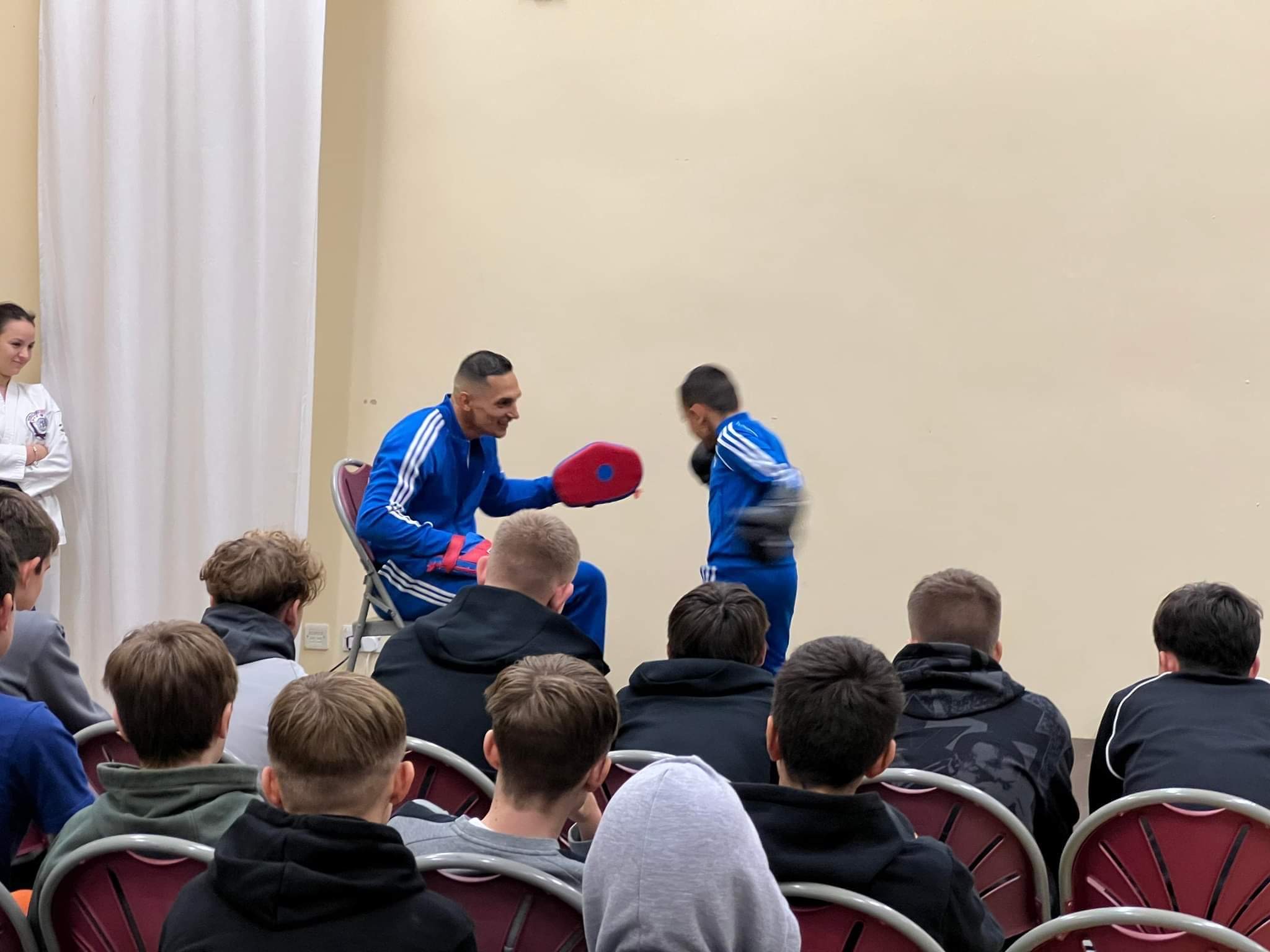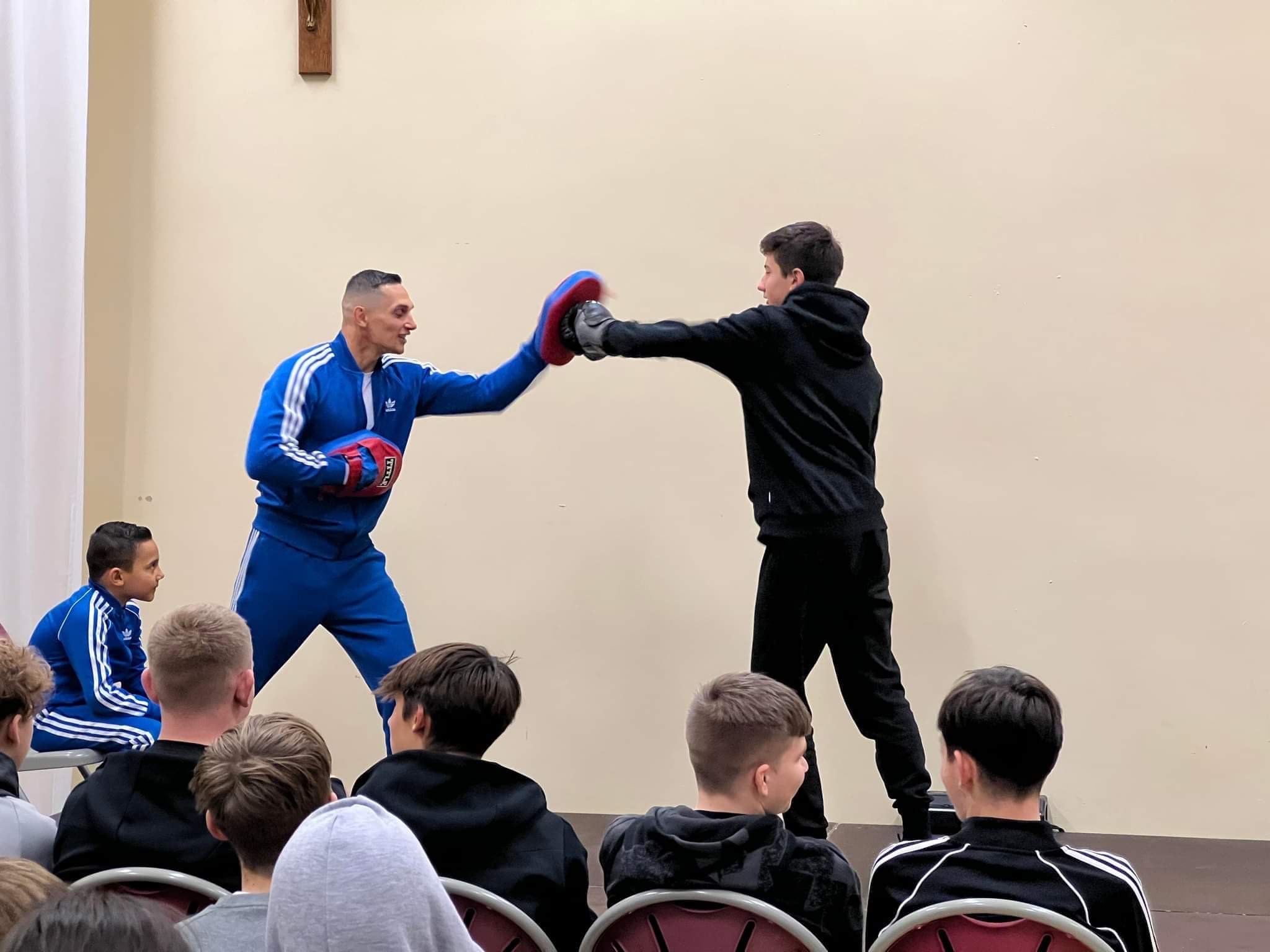 19 listopada 2022 roku 10 i 9 klasy miały zaszczyt gościc Łukasza Olszowskiego i jego synka Oliviera. Łukasz jest trenerem personalnym a jego dyscyplina sportowa to Kick boxing i muay thai 🥊. Rozpoczęliśmy wywiadem, który przeprowadziła pani Bernardetta Chmielewska z pomocą pań Katarzyny Niemkiewicz-Borowicz i Iwony Drummond. Następnie uczniowie mieli szansę na zadanie kilku pytań naszemu gościowi a potem już była wyczekana przez uczniów część czyli prezentacja dyscypliny. Łukasz wraz z synem zademonstrował podstawowe ruchy po czym uczniowie mogli założyć rekawice i spróbować „poboksowac” ze sportowcem. Emilka Targańska z klasy 10 zademostwowala nam swoją pasję Tang Soo Do i razem z gościem poćwiczyli uderzenia. Spotkanie zakończyło się sesją zdjęciową, którą możecie państwo zobaczyć poniżej. Jeszcze raz wielkie brawa dla naszego gościa i jego synka Oliviera , Emilki Targańskiej i wszystkich uczniów, ktorzy mieli możliwość zademonstrować swoje zdolności bokserskie.