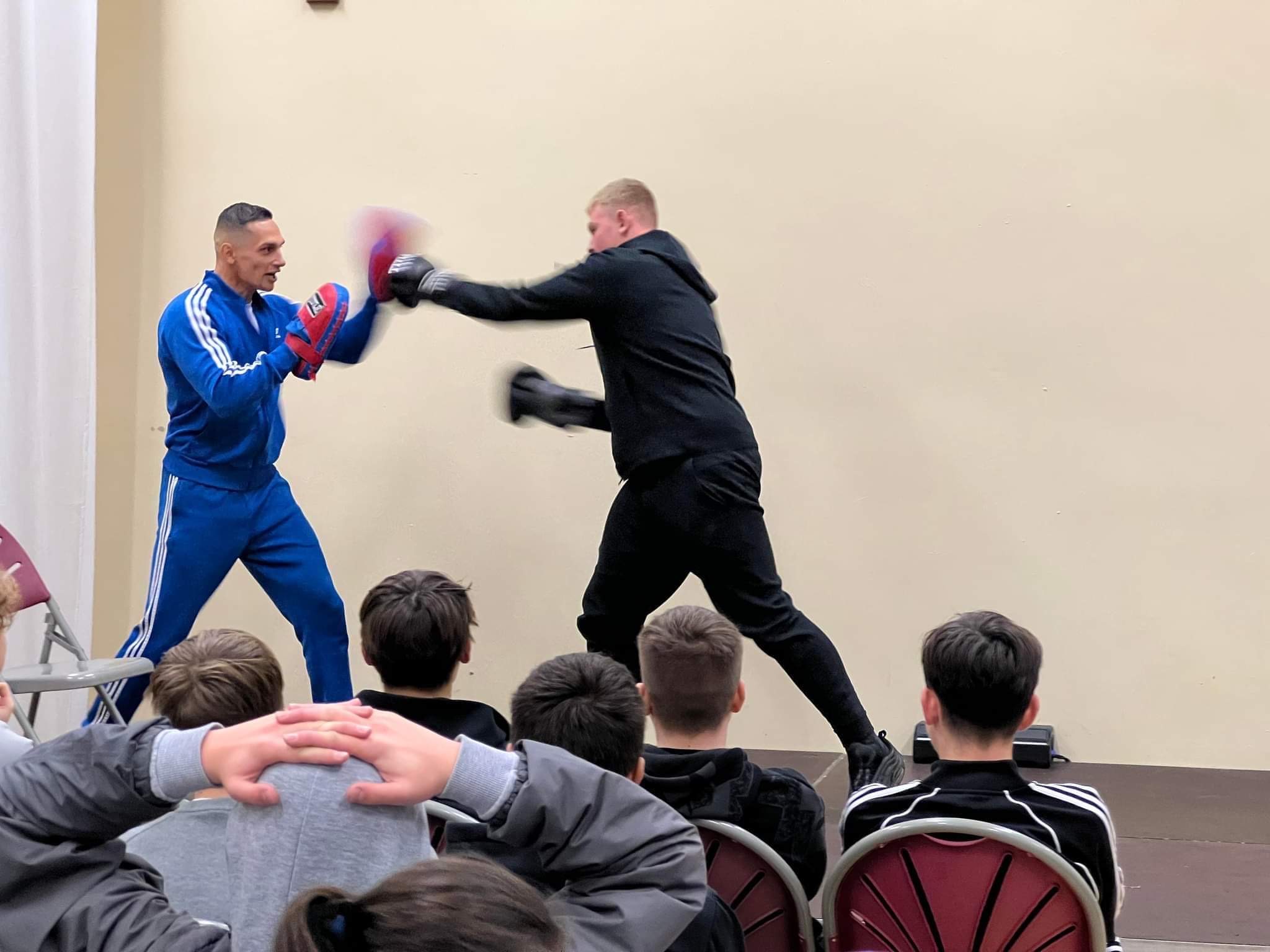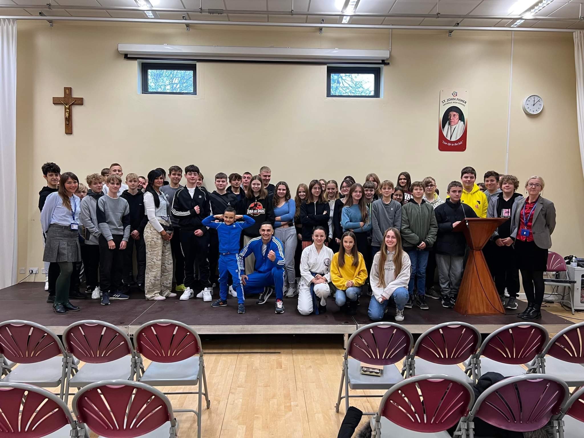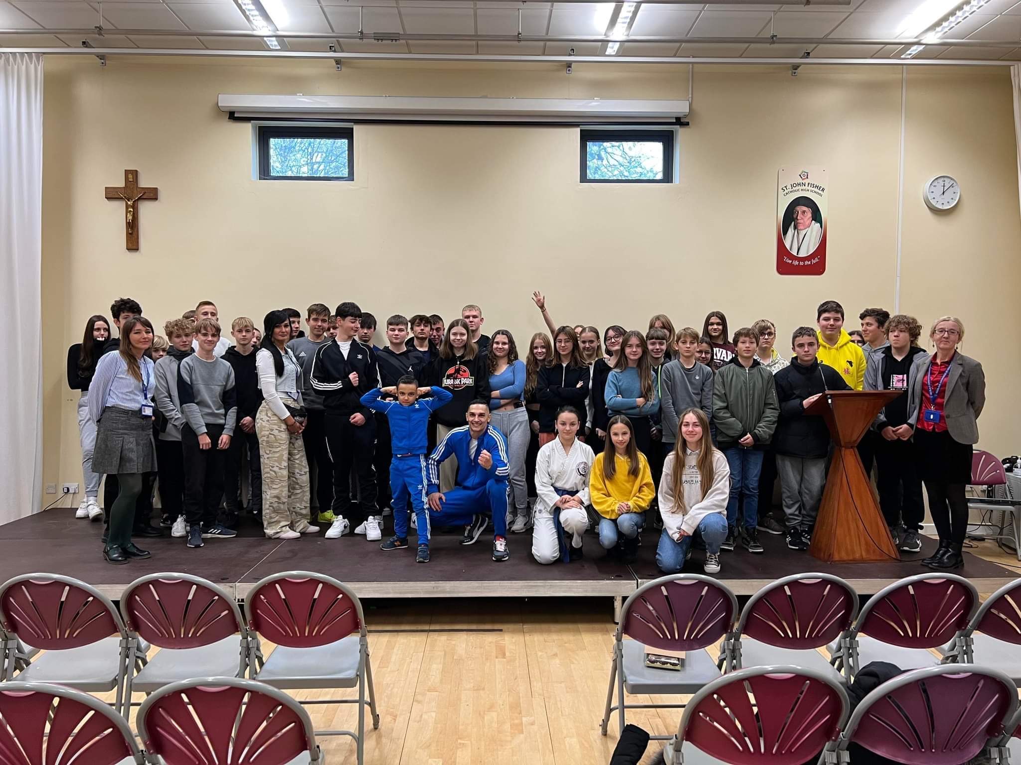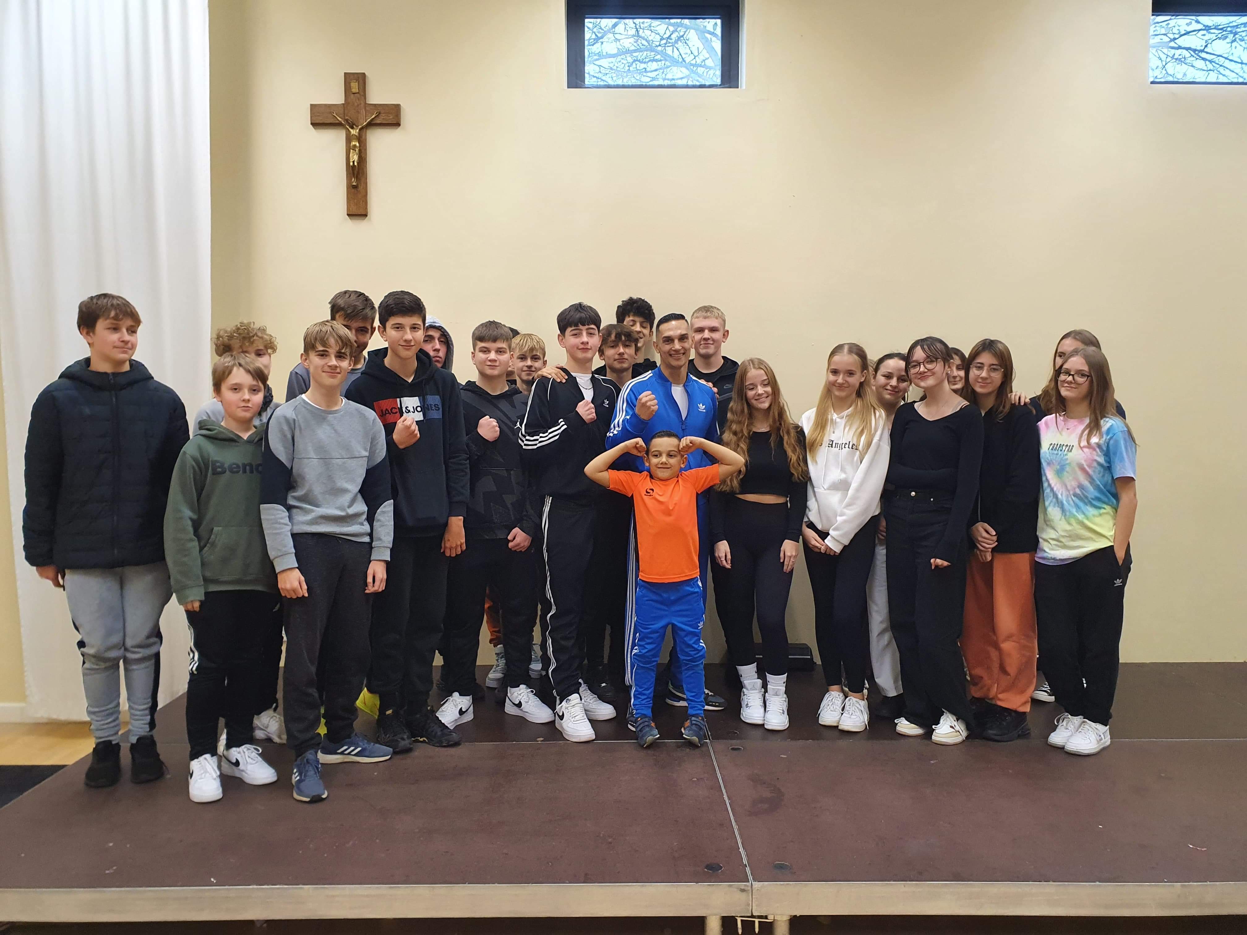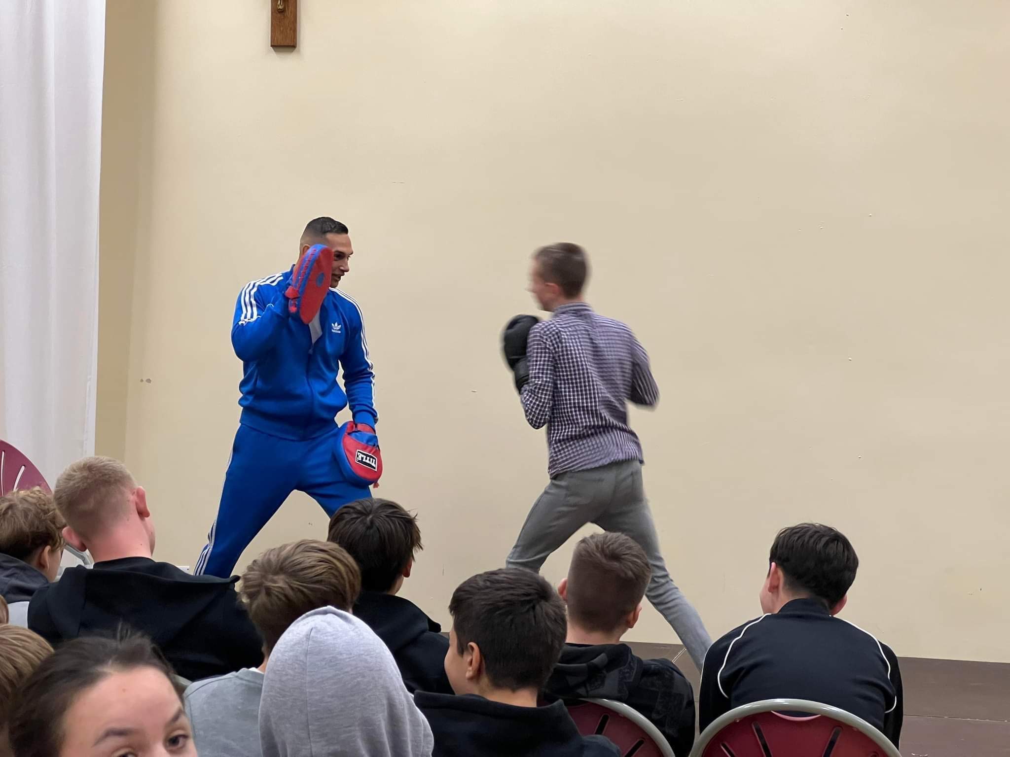 19 listopada 2022 roku 10 i 9 klasy miały zaszczyt gościc Łukasza Olszowskiego i jego synka Oliviera. Łukasz jest trenerem personalnym a jego dyscyplina sportowa to Kick boxing i muay thai 🥊. Rozpoczęliśmy wywiadem, który przeprowadziła pani Bernardetta Chmielewska z pomocą pań Katarzyny Niemkiewicz-Borowicz i Iwony Drummond. Następnie uczniowie mieli szansę na zadanie kilku pytań naszemu gościowi a potem już była wyczekana przez uczniów część czyli prezentacja dyscypliny. Łukasz wraz z synem zademonstrował podstawowe ruchy po czym uczniowie mogli założyć rekawice i spróbować „poboksowac” ze sportowcem. Emilka Targańska z klasy 10 zademostwowala nam swoją pasję Tang Soo Do i razem z gościem poćwiczyli uderzenia. Spotkanie zakończyło się sesją zdjęciową, którą możecie państwo zobaczyć poniżej. Jeszcze raz wielkie brawa dla naszego gościa i jego synka Oliviera , Emilki Targańskiej i wszystkich uczniów, ktorzy mieli możliwość zademonstrować swoje zdolności bokserskie.