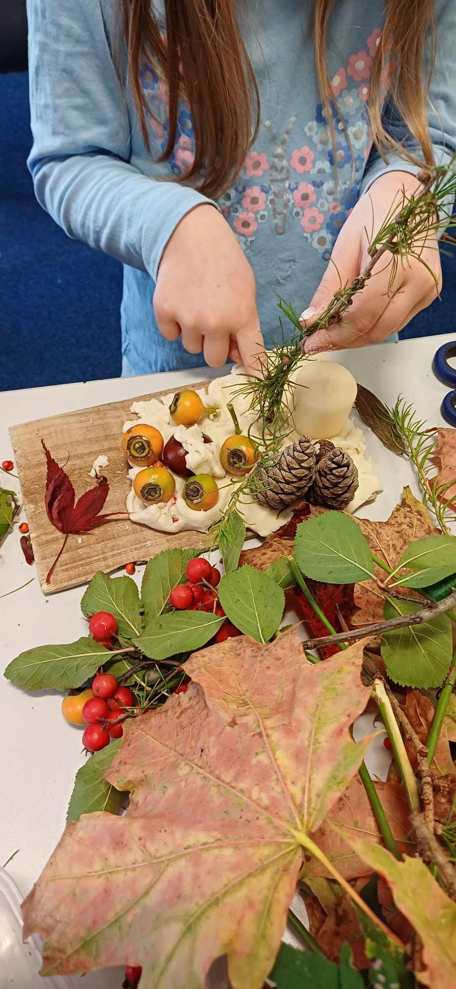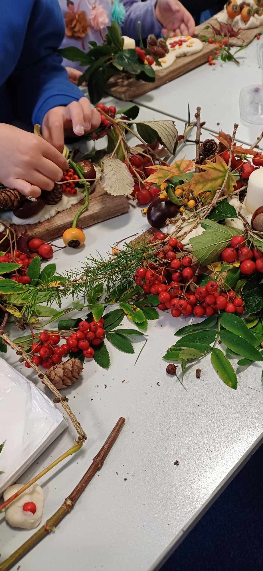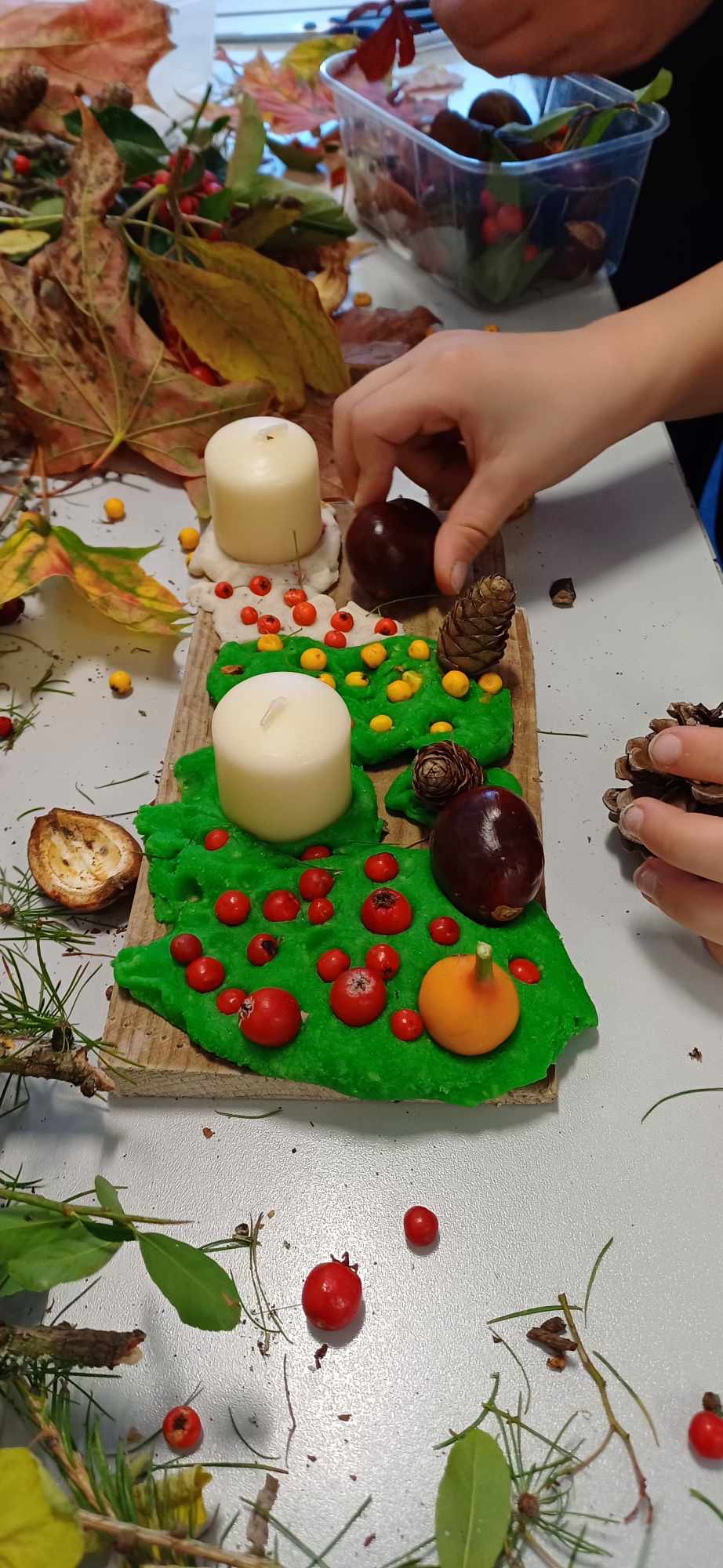 Dzieci zrobily przepiekne , nasycone cieplymi barwami natury stroiki z „jesiennych skarbow”.