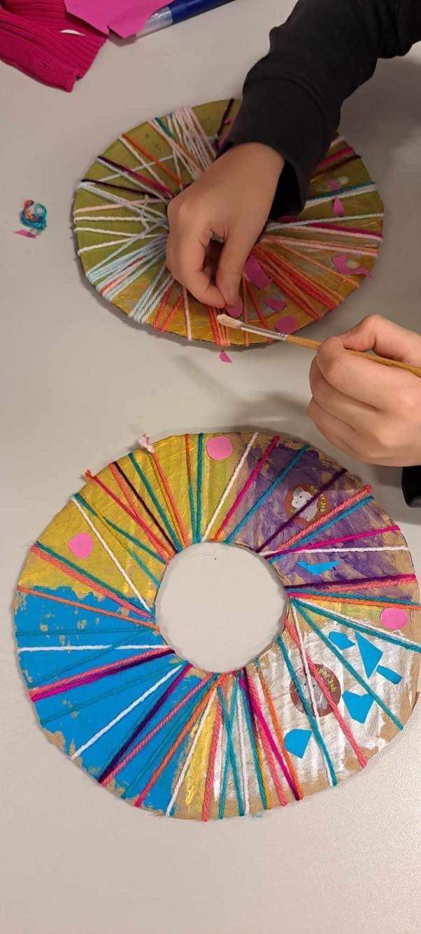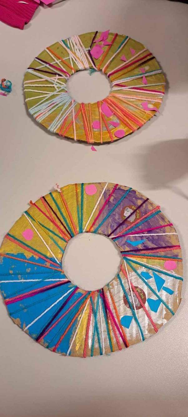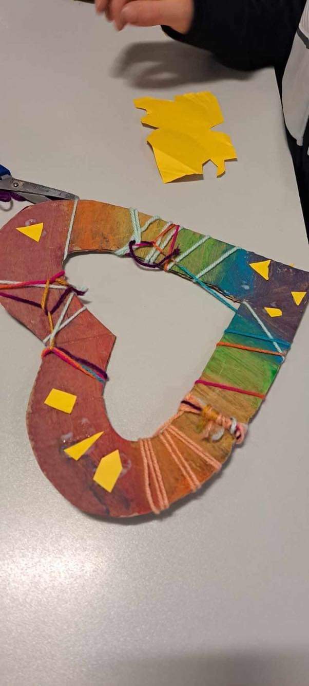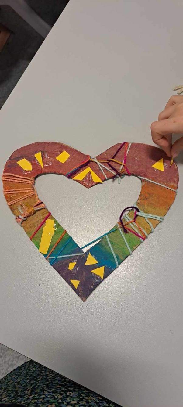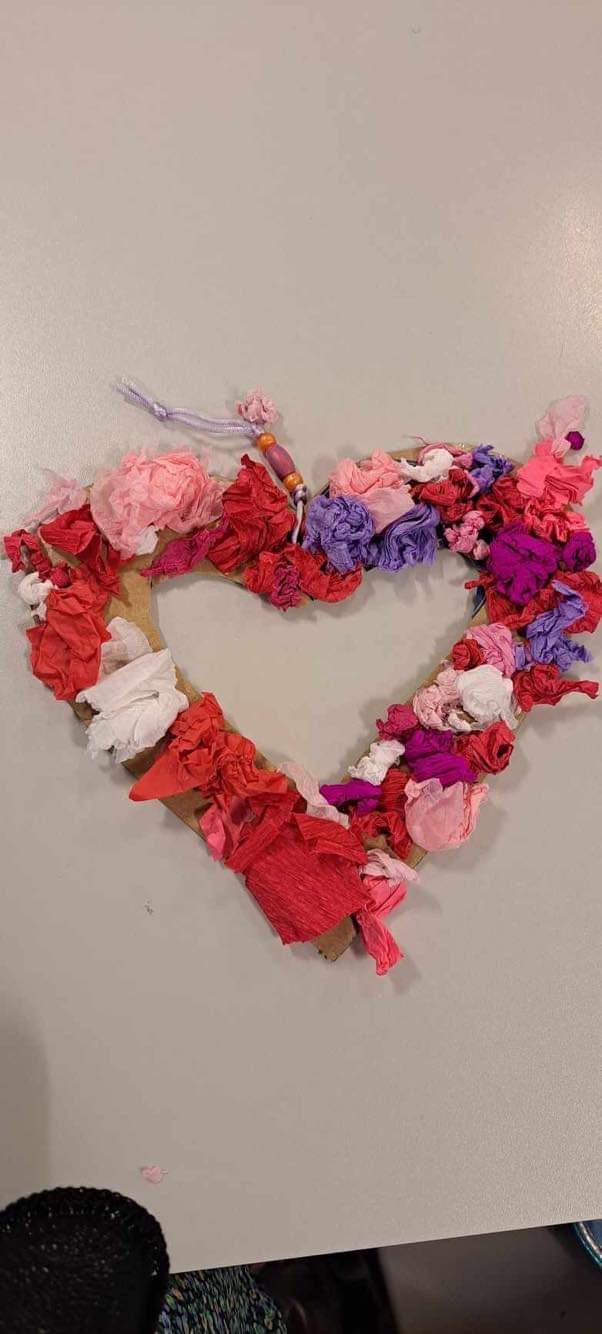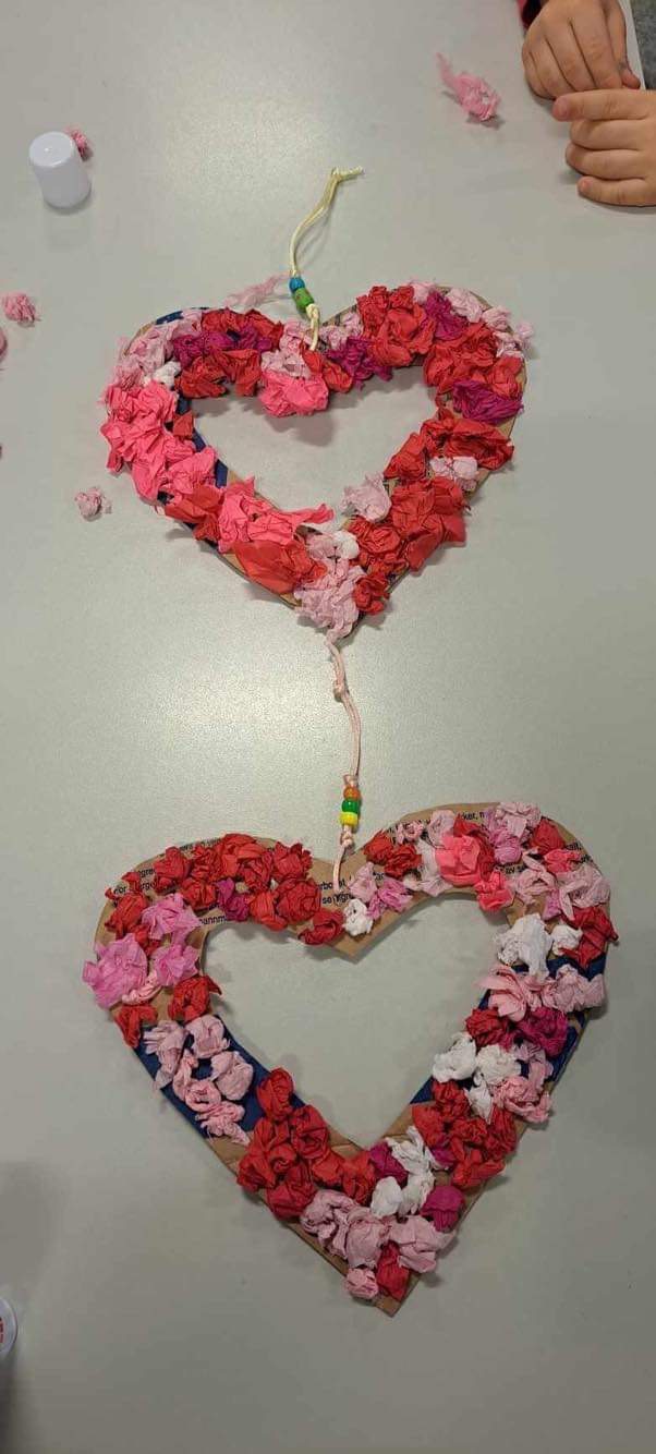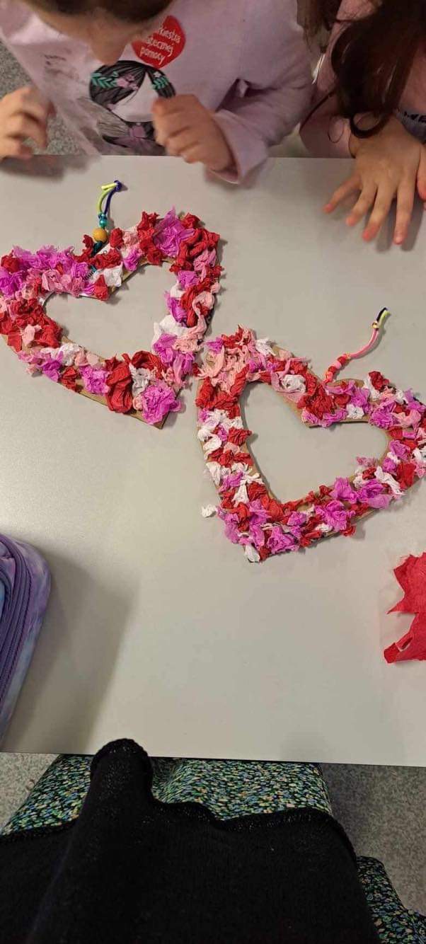 Mamy tutaj: Serca Walentynkowe, gdzie nasi mali artysci cwiczyli paluszki rolujac kulki z bibuly , oraz Paczki z tektury, ktore wygladaja jak “ nie z tej ziemi” .