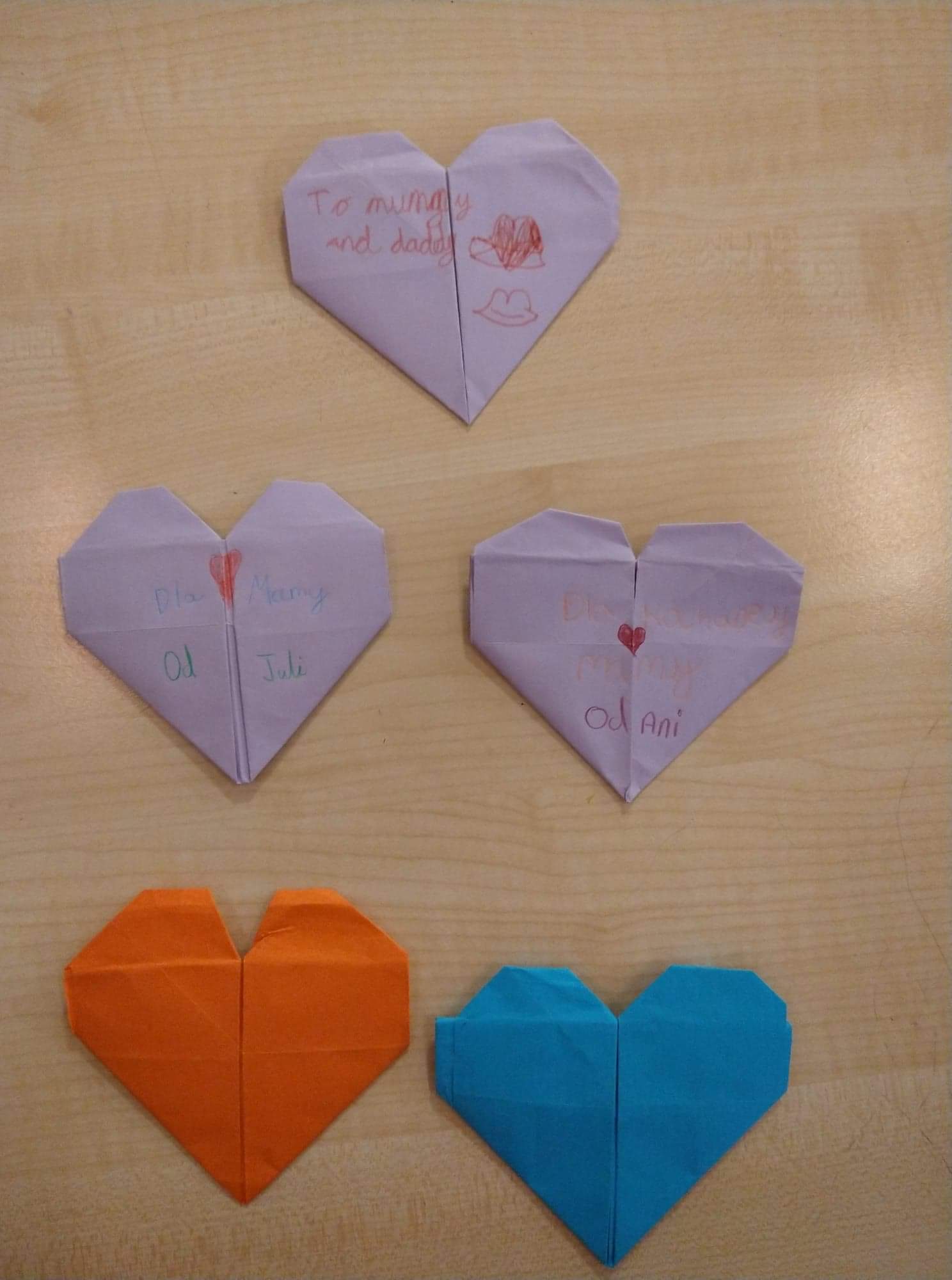 Grupa „Złote Ołówki” z okazji Walentynek wykonała serduszka i motylki metoda origami.