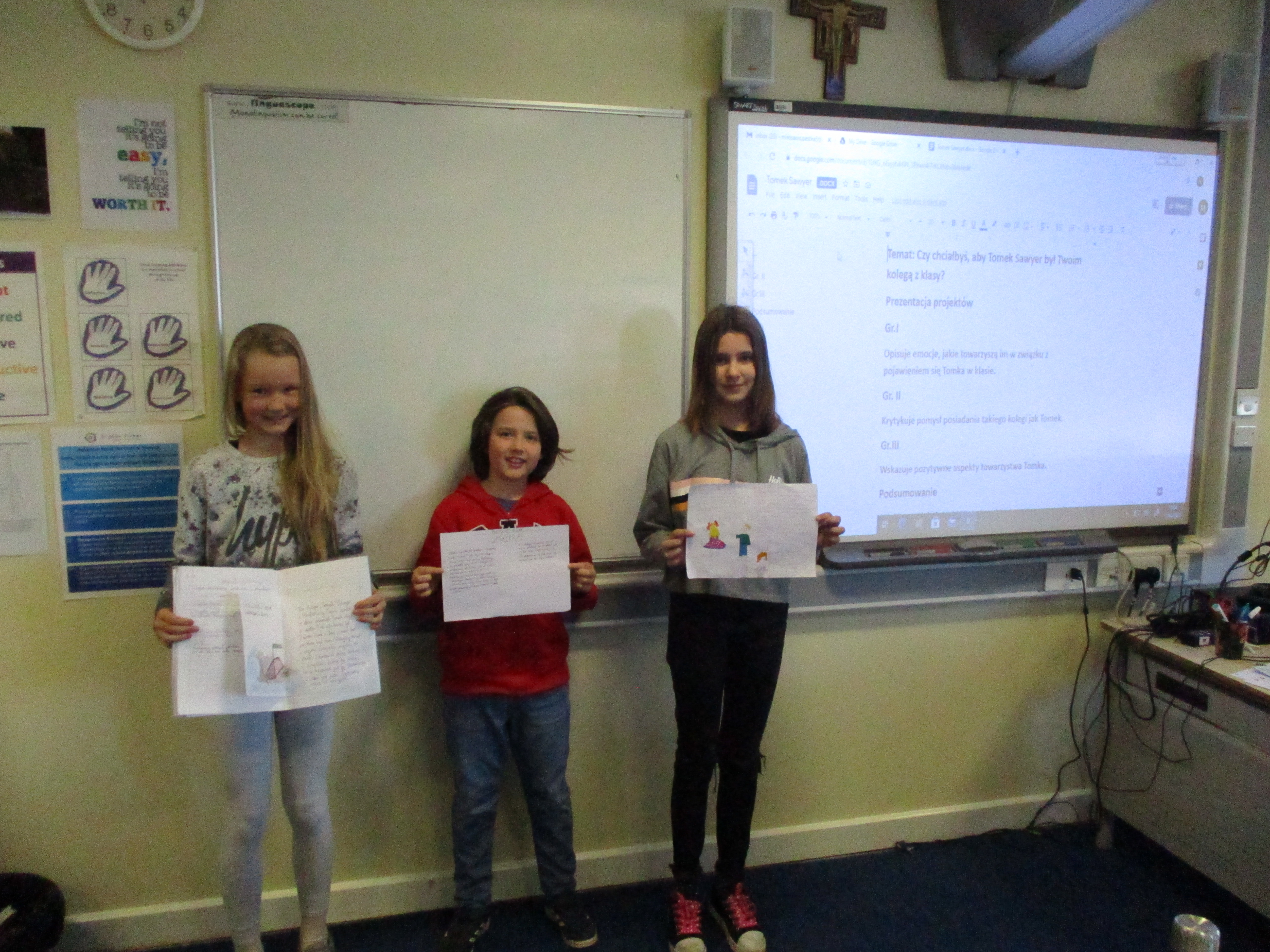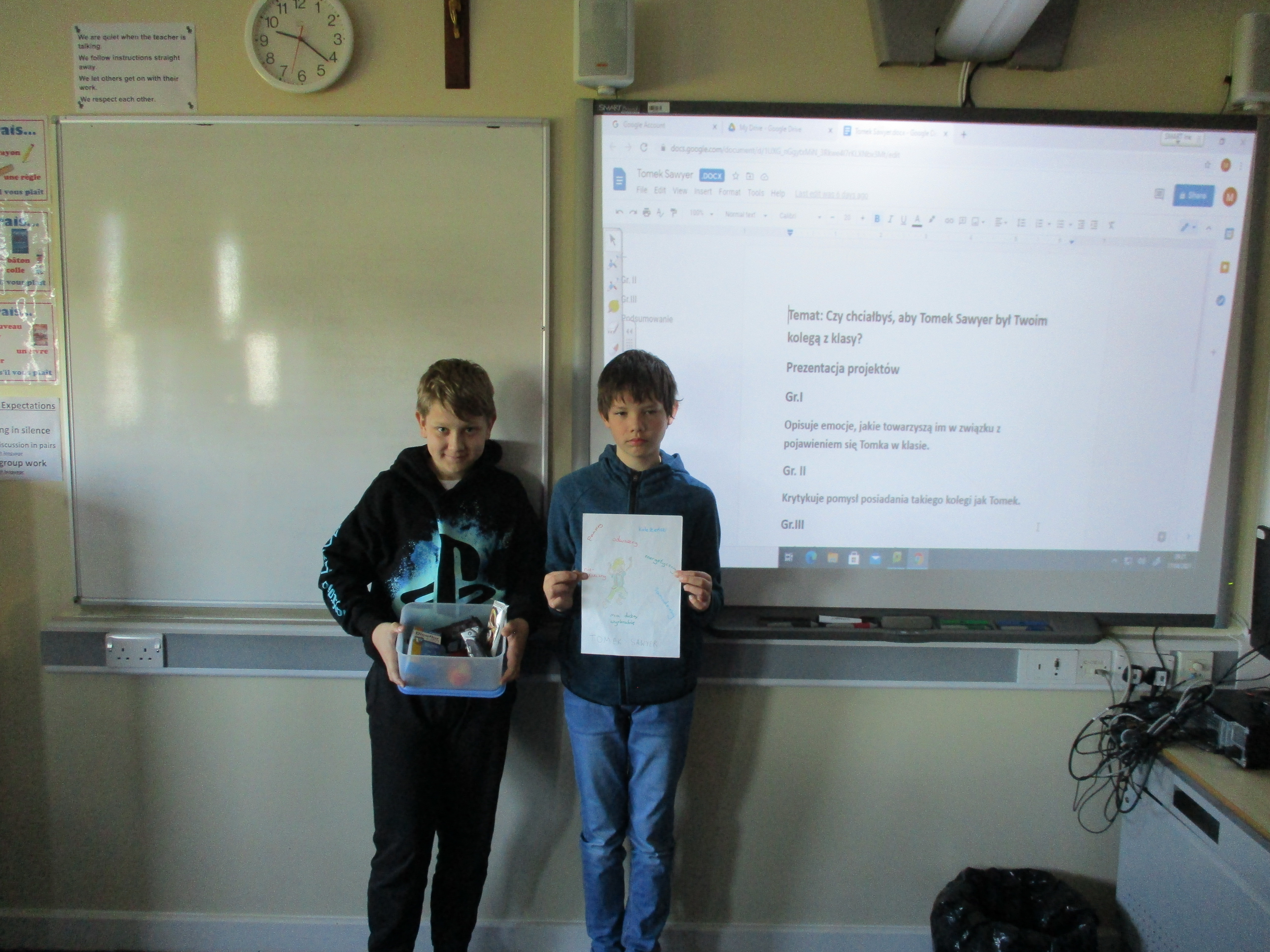 W związku z omawianiem lektury “Przygody Tomka Sawyera” uczniowie kl. VIA oraz kl. VIB na zajᶒciach jᶒzyka polskiego zaprezentowali na forum klasy interesujące projekty. Najciekawsze prace to: projekt w postaci kilkustronicowej książki, miniaturowy komiks, prace plastyczno-literackie, krzyżόwki czy pudełko pełne m.in. “skarbόw” Tomka- głόwnego bohatera lektury.