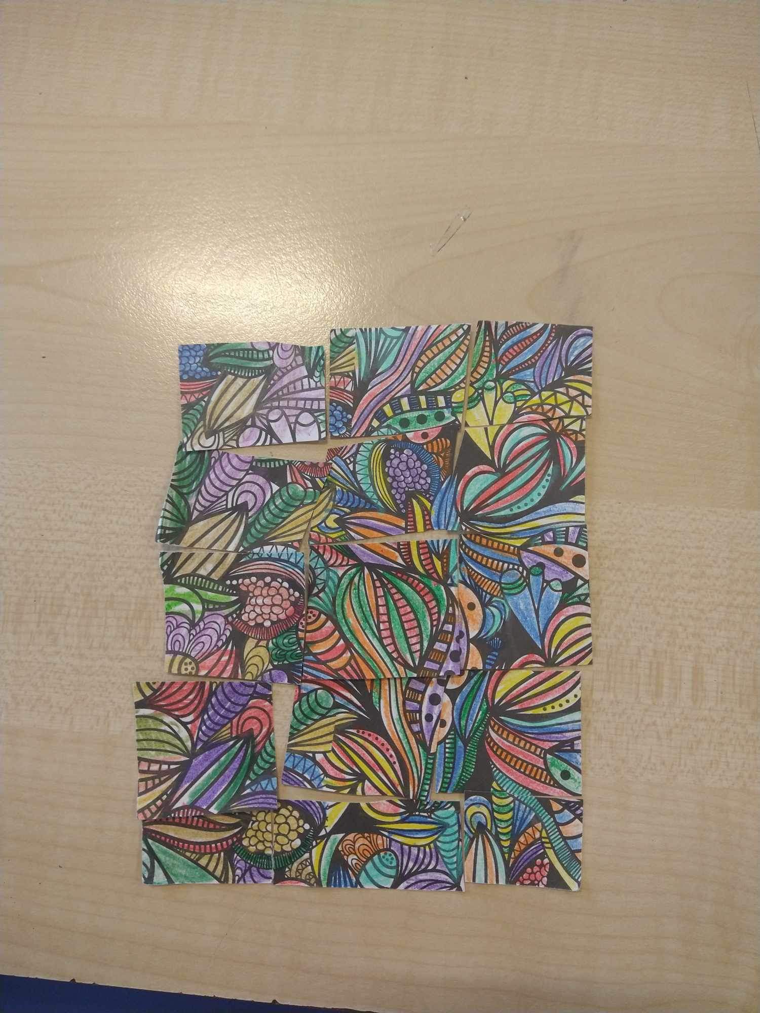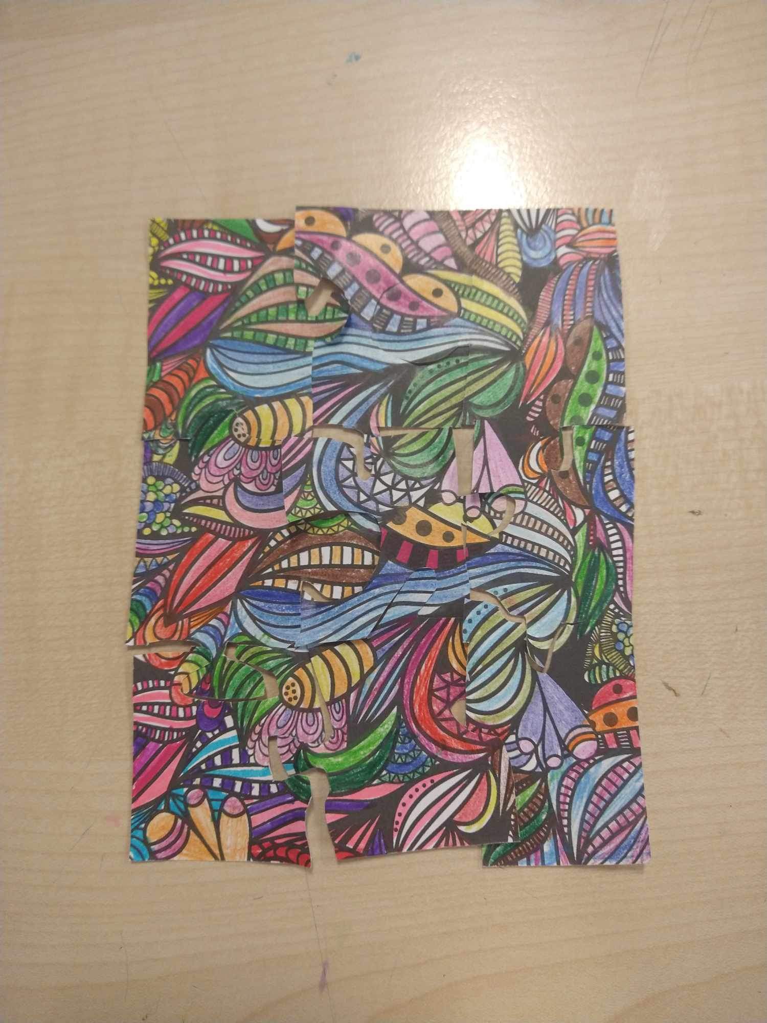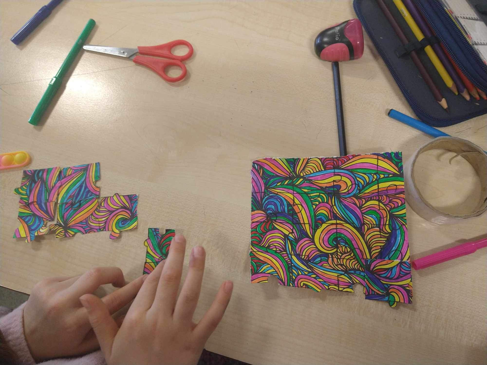 Uczniowie na zajᶒciach plastyki nie tylko samodzielnie wykonali puzzle, ale je rόwnież ułożyli.