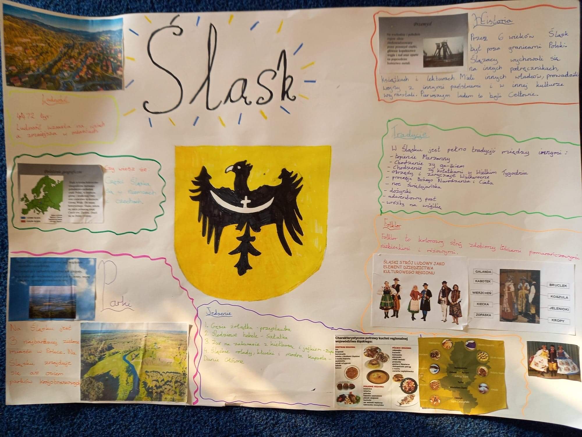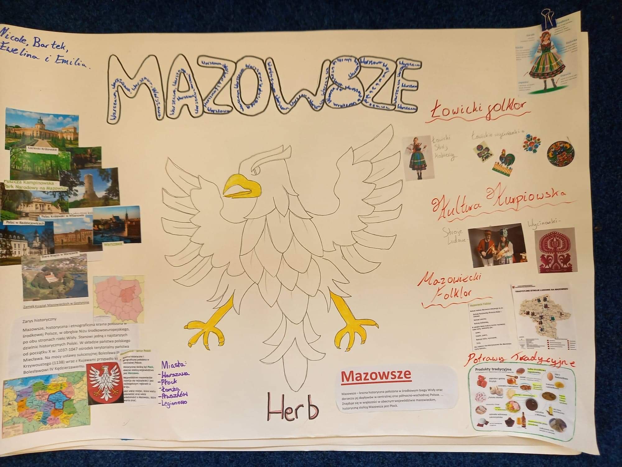 Uczniowie klas 7dmych na lekcjach geografii wykonali fantastyczne postery na temat regionów Polski: Mazowsza, Śląska, Małopolski, Wielkopolski i Pomorza.