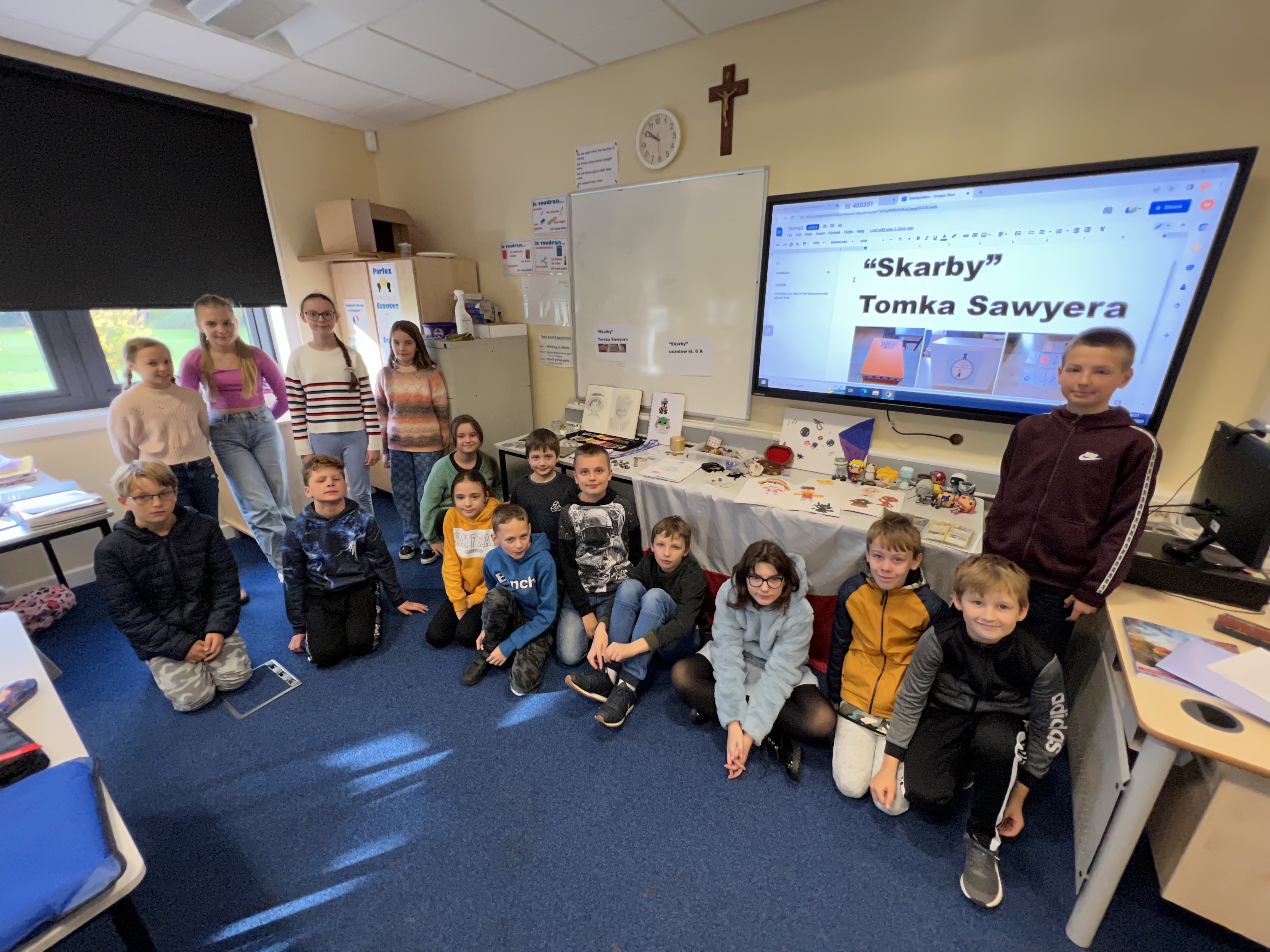 W związku z omawianiem lekturyPrzygody TomkaSawyerauczniowie kl. 6 A oraz uczniowie kl. 6 B zaprezentowali na lekcjach jzyka polskiego swojeskarby”- przedmioty, ktόre kolekcjonują lub mającedla nich wartość sentymentalną, gdyż otrzymali je odosόb bliskich.