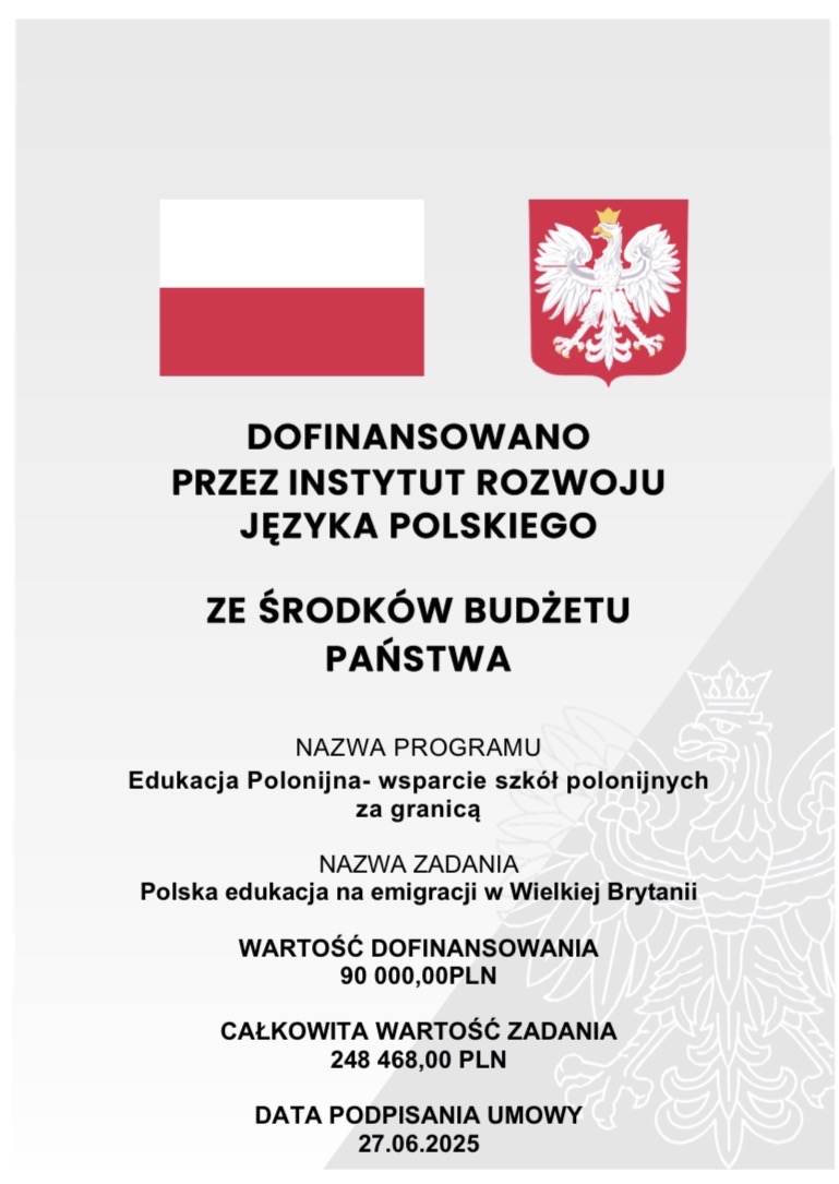 Dofinansowano przez Instytut Rozwoju Języka Polskiego ze środków budżetu państwa w ramach dotacji celowej na podstawie umowy o dofinansowanie z dnia 27.06.2025 w ramach wykonania zadania „Polska edukacja na emigracji w Wielkiej Brytanii”.